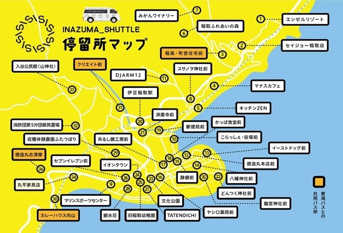 東伊豆町と合同会社うさぎ企画は、伊豆稲取駅3キロ圏でオンデマンド交通を中心とした社会実験(以下、本実験)を2023年11月1日(水)~12月27日(水)に行います。本実験では、移住者を含む町民、観光客、ビジネス客のニーズを踏まえた36カ所の交流拠点を停留所として設置し、オンデマンド交通(10人乗りワゴン1台 名称:「INAZUMA_SHUTTLE」(電シャトル))を走行させ、移動課題と交流課題の解決を目指します。また交流拠点としての活用が検討されている旧稲取幼稚園をコアな停留所として活用し、実験期間中は約40本の交流イベントを開催し、町内の活性化につなげます。