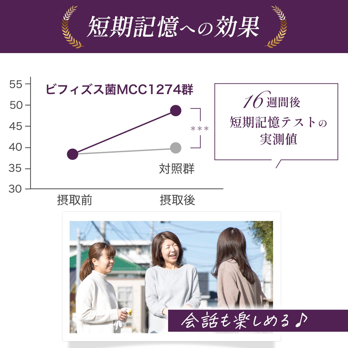 ※ヒト臨床試験において、単一のビフィズス菌生菌体が年齢とともに低下する認知機能(記憶力)を維持する働きを示したことが、世界で初めて論文として報告されました。