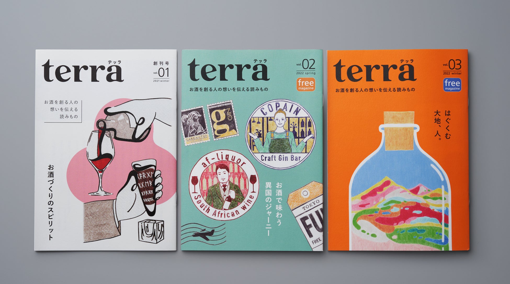 お酒は、地球、大地(terra)の力、そして人の手から、つくられる。そのことをもっと様々な方に知ってほしい。そんな想いで「お酒を創る人の想いを伝える」フリーマガジンterraを2021年12月に創刊をしました。編集長大島は元ワインソムリエール。コロナ禍でお酒業界全体に冷たい視線が送られるのを感じ、そこにいる「人の想い」をテーマにしたいと感じたことが創刊のきっかけです。お酒を創る人の想いを伝え、人と人、文化と人を誌面で繋いでいくことを目的に、対面でコミュニケーションを軸とした媒体づくりをしております。この度、noteを開設し、terra本誌では伝えきれないお酒を創る人の想いやエピソードをより広く、多くの人たちへお届けしてまいります。