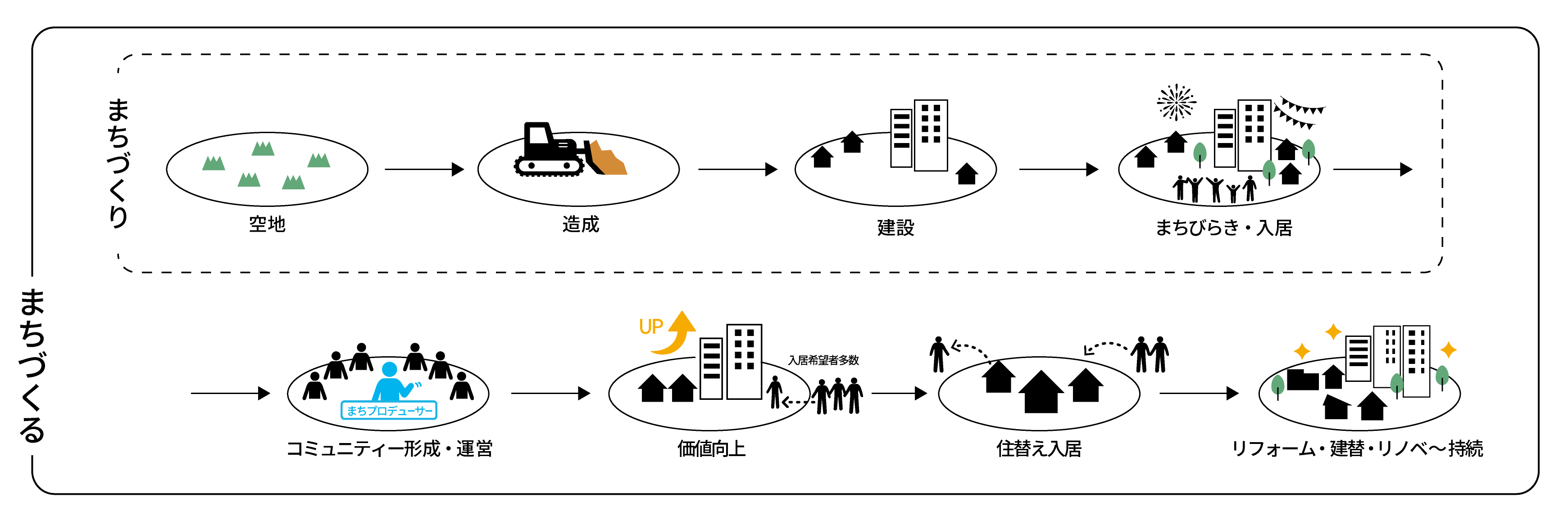当社グループが考える「まちづくり」とは、開発して終わりでなく「まち」を育てていく継続的な活動であると位置づけ、「まちづくる」という言葉をグループブランドに採用しています。