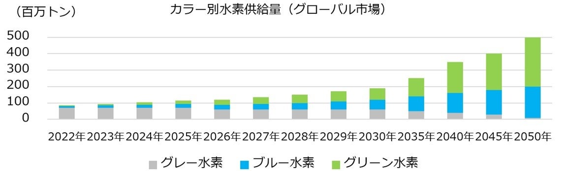 [グリーン水素・ブルー水素・グレー水素の供給量推移予測(グローバル)]