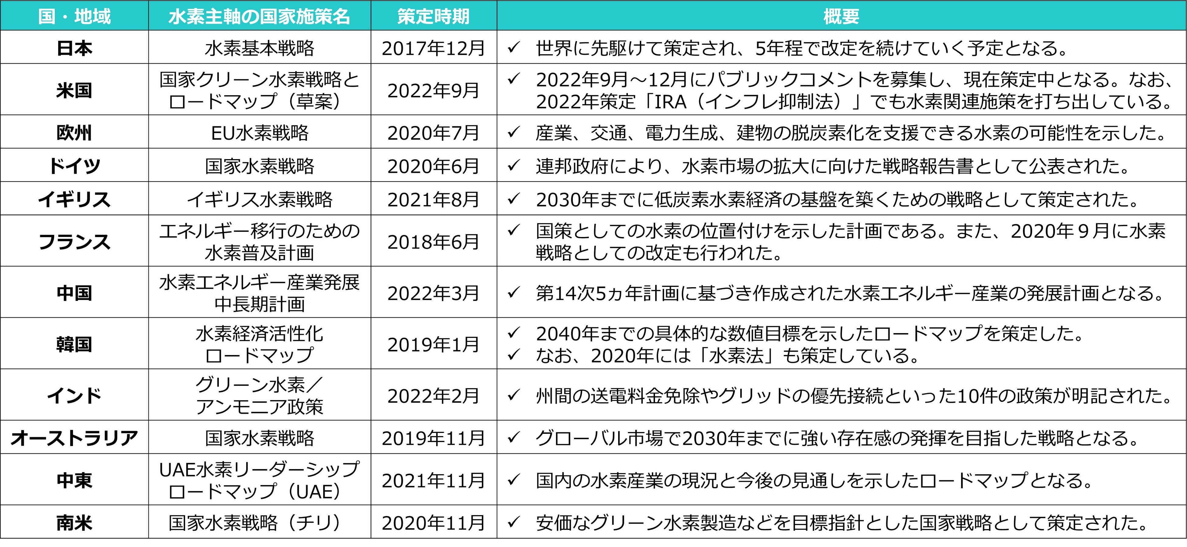 米国では、2022年に策定した「IRA(インフレ抑制法)」を始めとして、環境負荷の低い水素製造への強力な補助政策を打ち出しており、米国内における水素産業の育成を進めている。欧州では、ロシアによるウクライナ侵攻によって、エネルギー安全保障体制の見直しが急務となった結果、水素を始めとする新エネルギーの需要が前倒し的に拡大しており、グリーン水素やブルー水素の国内製造基盤構築、および域外からの調達体制の構築を急速に進めている。また、オーストラリアや中東といった石油資源に恵まれた国・地域でも、グローバル市場で脱炭素化が進む中、新しい対外政策・外資獲得施策として水素関連施策に注力度を高めている。特にオーストラリアは、地理的に近いメリットを生かし、日本およびアジアの水素需要拡大をビジネスチャンスとした水素輸出産業化を進めている。
