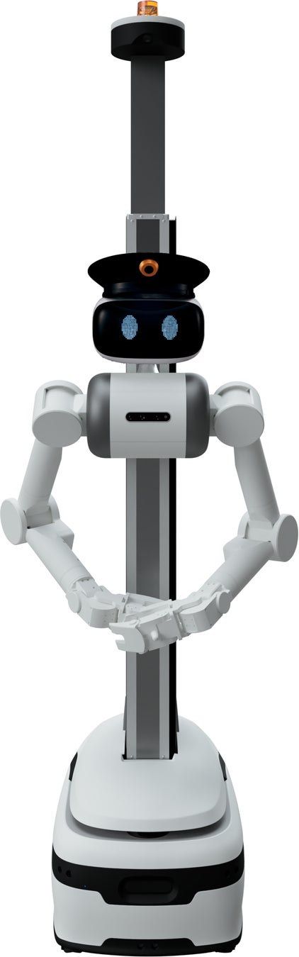 「ugo」の特徴は、2本のアームを備えていること。カメラを使った監視や警備だけでなく、アームを使ってモノをつかむことや、エレベーターの呼び出しができます。そのため、上下階への移動も可能です。声掛けや会話は、防災センター内の警備員が「ugo」を通じて行います。