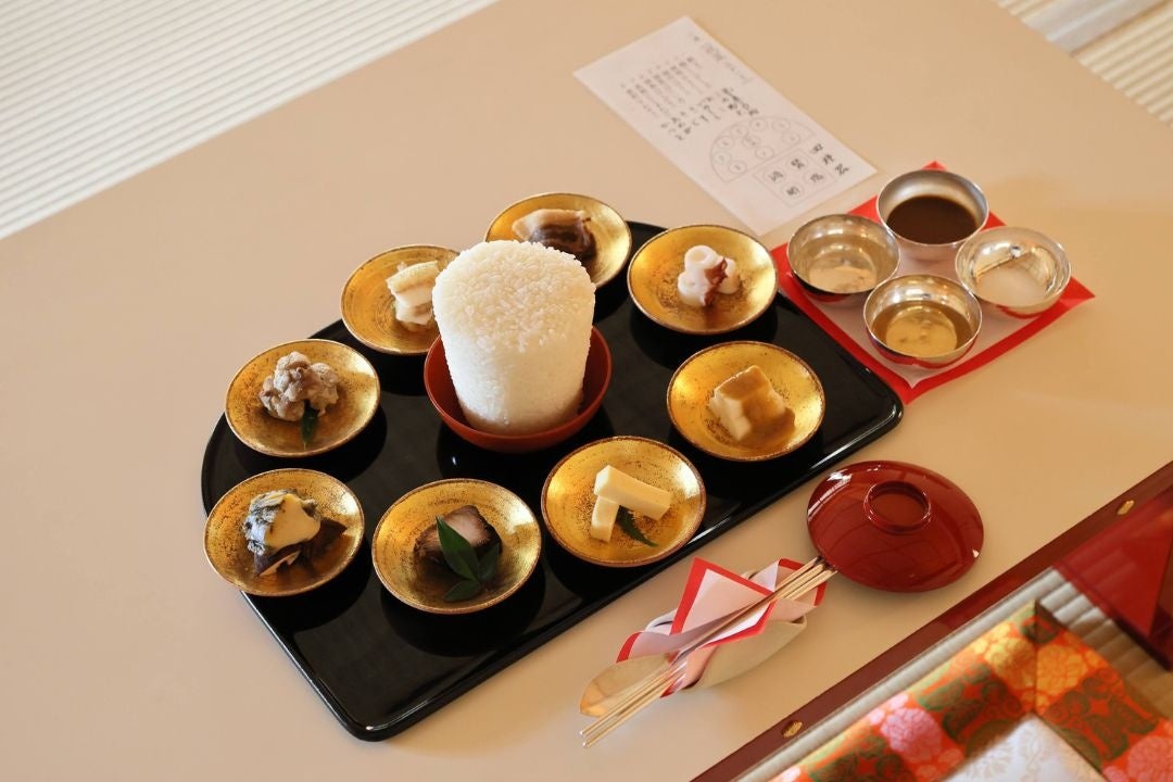 昼食は「京料理 六盛」にて、平安貴族たちが愛用した練香の香りとともに、創作平安王朝料理を味わいます。当時の貴族たちが楽しんだ料理、大臣大饗を現代の味覚に合わせて再現したものです。
