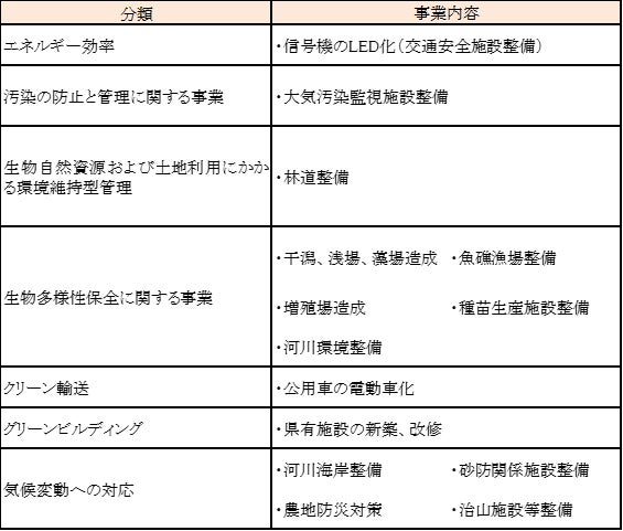 本債券の発行による調達資金は、愛知県が取り組む環境改善効果のある下表のグリーン化事業に充当されます。
