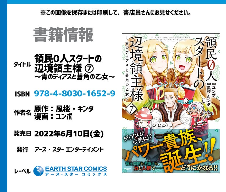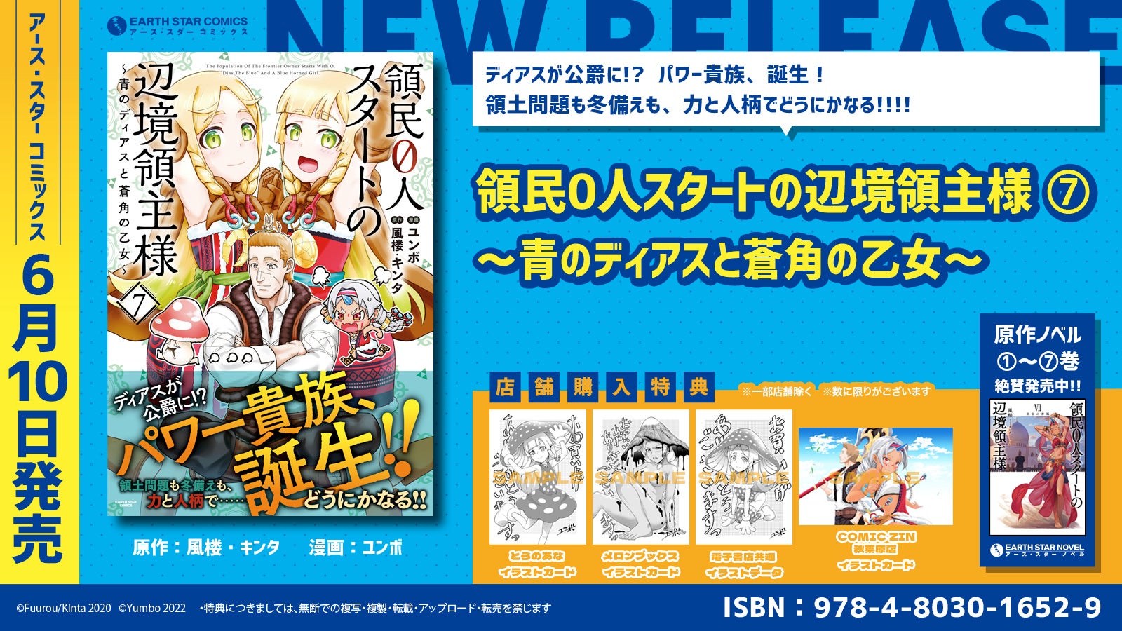 アース・スターノベルで刊行中の人気ノベル作品が原作で、現在コミック アース・スターで掲載している人気作品『領民0人スタートの辺境領主様~青のディアスと蒼角の乙女~』コミックス第7巻を6月10日(金)に発売いたします。