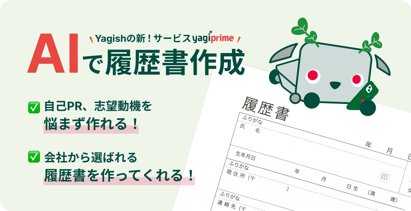 yagish(ヤギッシュ)累計利用者1,000万人突破。AI活用で履歴書志望動機を最適化。yagioffer(ヤギオファー)利用企業2,600社突破