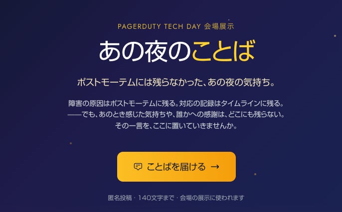 「#あの夜のことば」は、そんな"記録には残らない想い"を可視化する試みとして、インシデント対応の現場で感じた率直な気持ち、チームメンバーへの感謝、あるいは次に向けた決意など、140文字以内で自由に投稿いただく企画です。投稿いただいたことばは、匿名で会場に展示させていただきます。