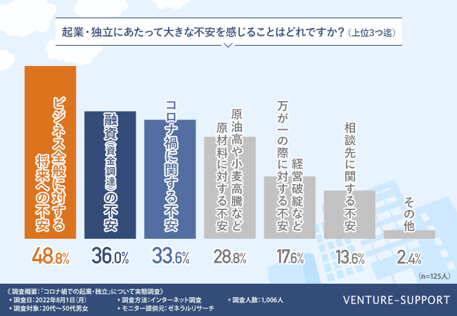 - 起業・独立にあたっての不安としては、「ビジネス全般に対する将来への不安」が最多となった