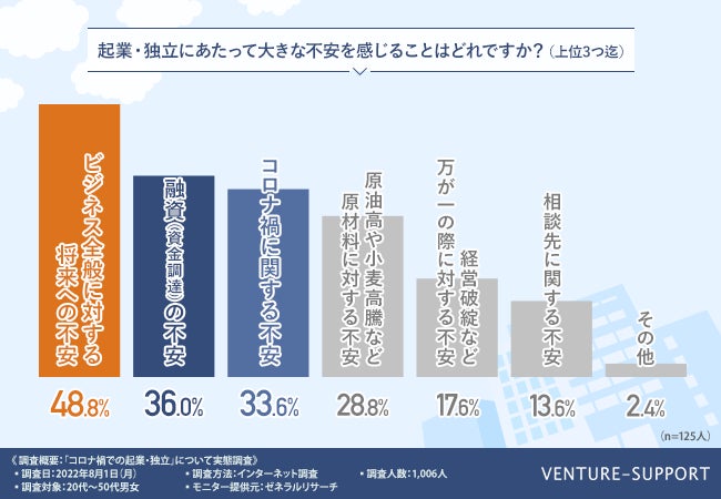 一方、「起業・独立にあたって大きな不安を感じることはどれですか?(上位3つ迄)」と質問したところ、半数近く(48.8%)が「ビジネス全般に対する将来への不安」と回答した。続いて「融資(資金調達)の不安(36.0%)」や「コロナ禍に関する不安(33.6%)」という結果となった。