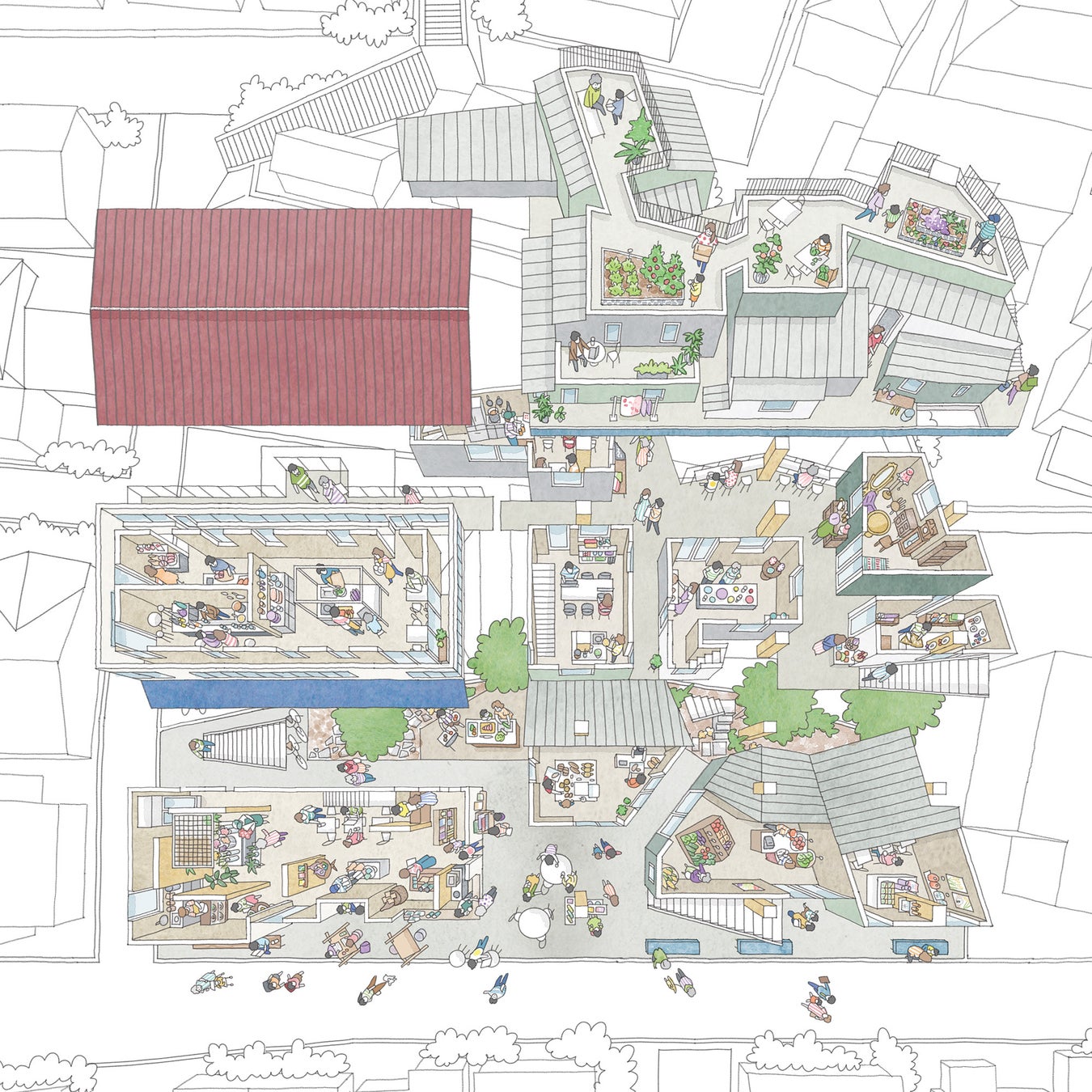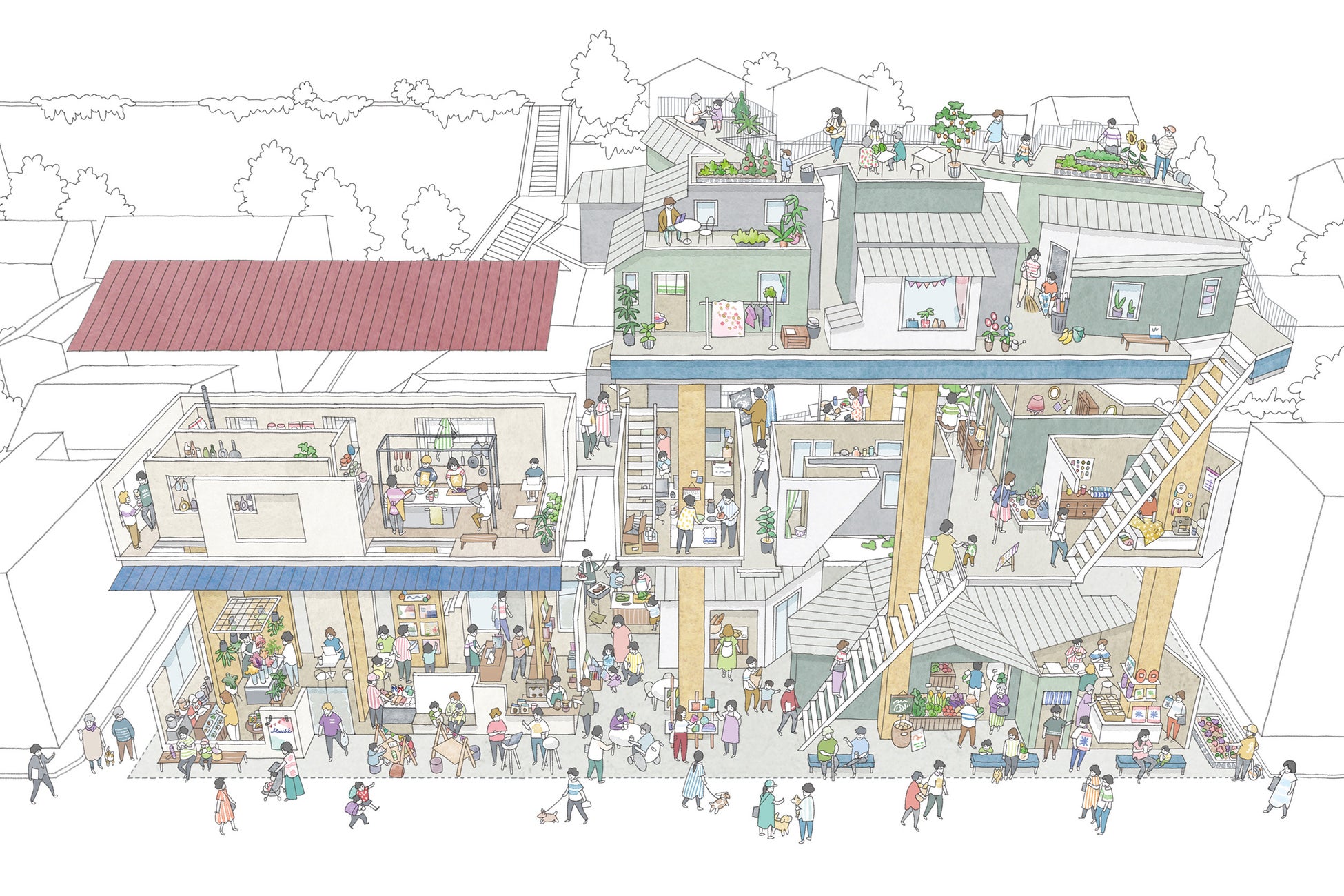 テナントや住居にあるキッチンだけでなく、時間貸しのシェアキッチンや自由に使えるコモンキッチン、屋外のアウトドアキッチンなど様々な使い方ができるキッチンを設ける予定です。また、テナント・住戸の隙間や屋上は地域住民も自由に使うことができるようにすることで、ダイニングの場も開くようにしています。施設全体をとおして、出店者・入居者だけでなく、近隣住民も気軽に食事をしたり料理をしたりできる、開かれた食の場を創り出していきます。