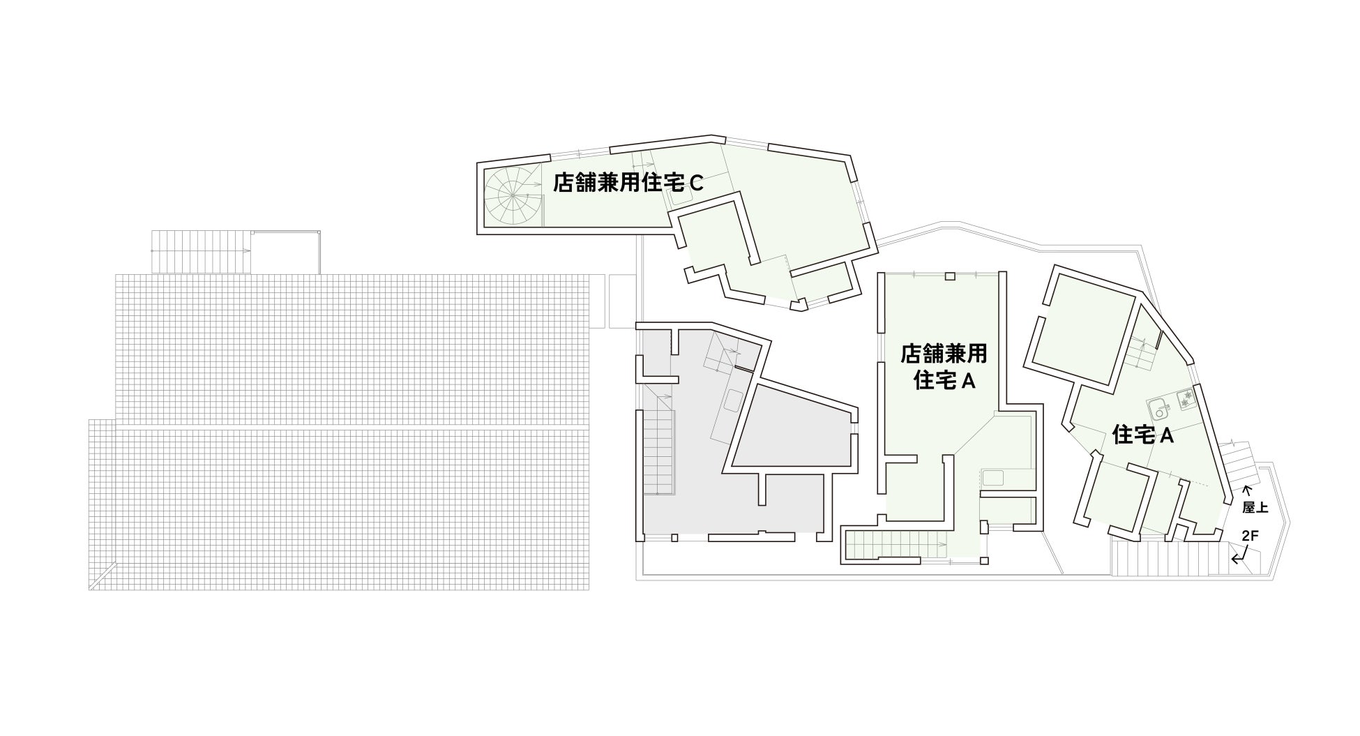 3Fは住居スペースとなっております。2-3Fメゾネット形式の店舗兼用住宅が3戸、単独住戸が1戸あります。