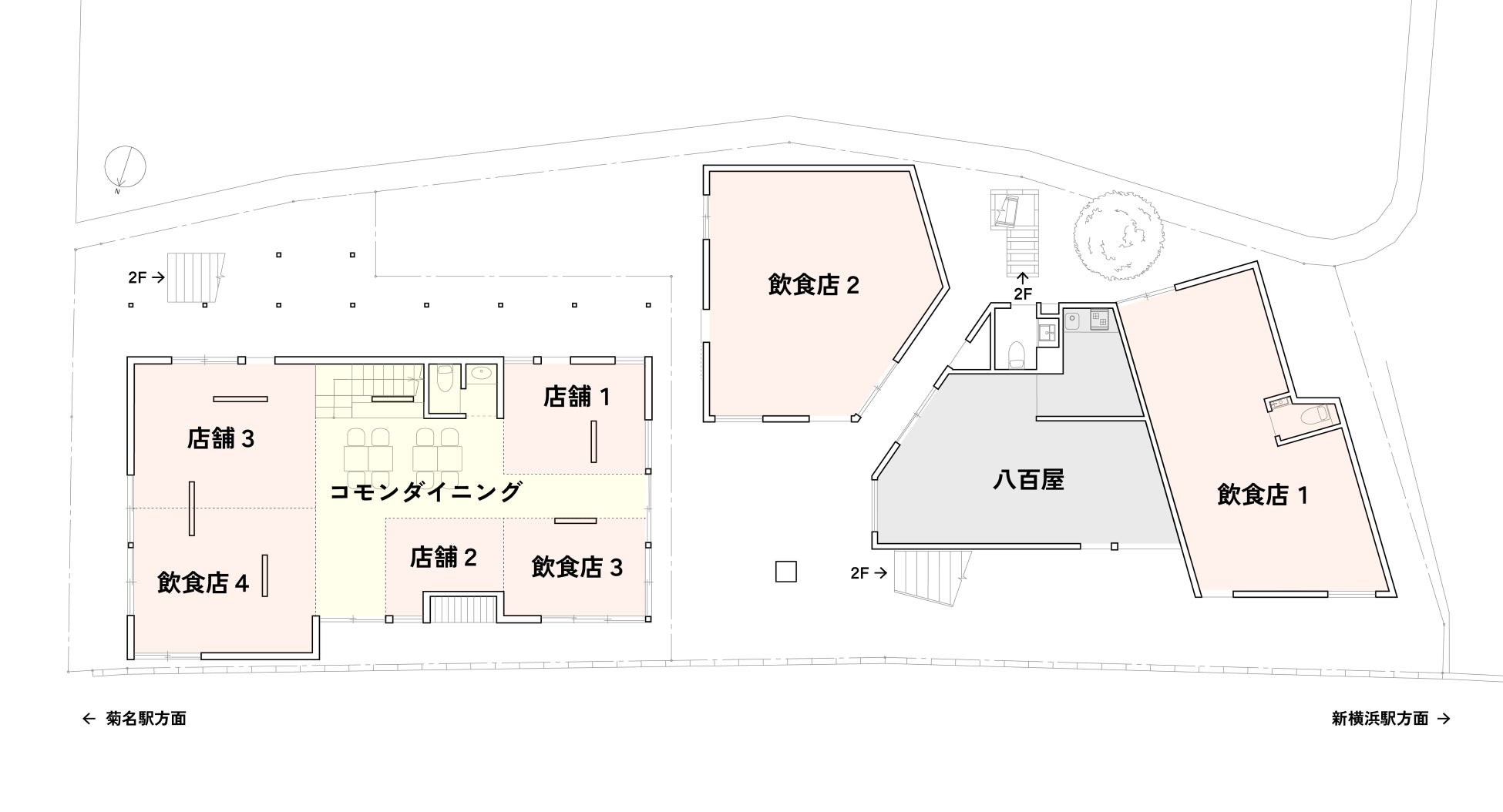 2Fは食にまつわる生活雑貨の店舗や誰でも使えるコモンキッチンなどを考えております。ウミネコアーキの事務所も入居します。