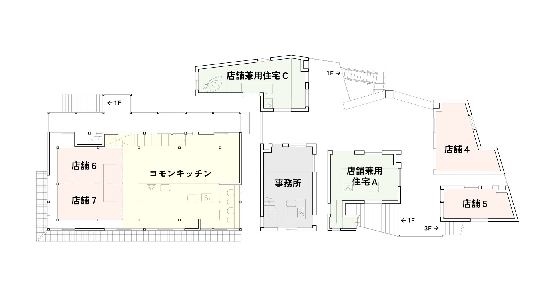 1Fは飲食店や食品を扱う店舗、菓子工房、共用のアウトドアキッチンなどを考えております。
