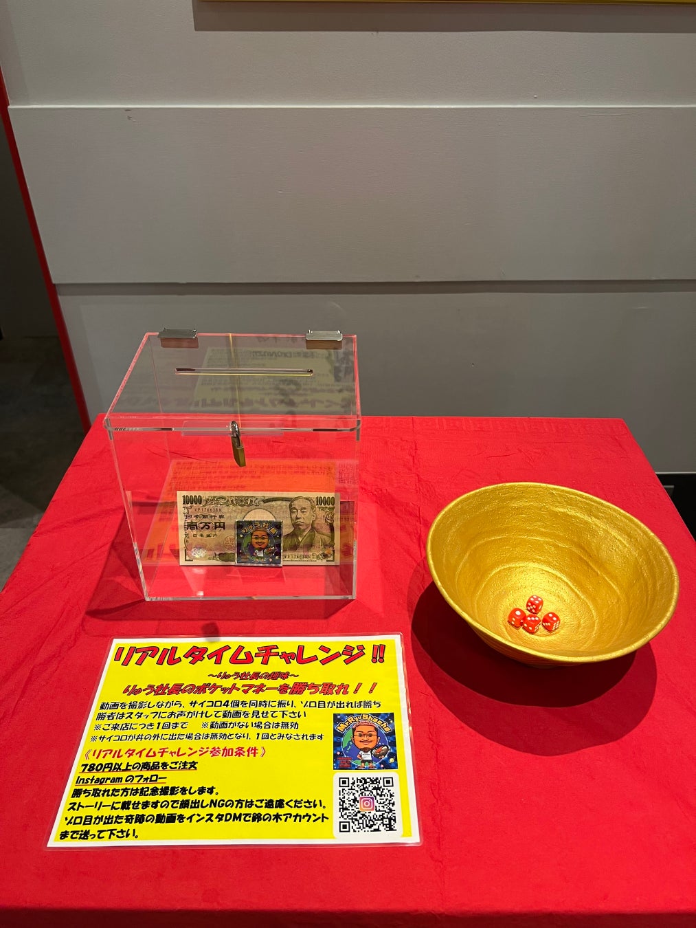店舗に常設されてある透明のBOXにりゅう社長のポケットマネーが入っており中身はりゅう社長の気分で変わります。