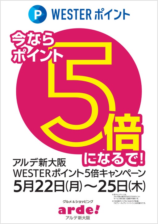 5月22日(月)~5月25日(木)までの期間中に、アルデ新大阪でWESPOアプリまたはWESTERアプリを提示してWESTERポイントをためると、通常は110円(税込)で1ポイントのところ、110円(税込)で5ポイントたまります!!