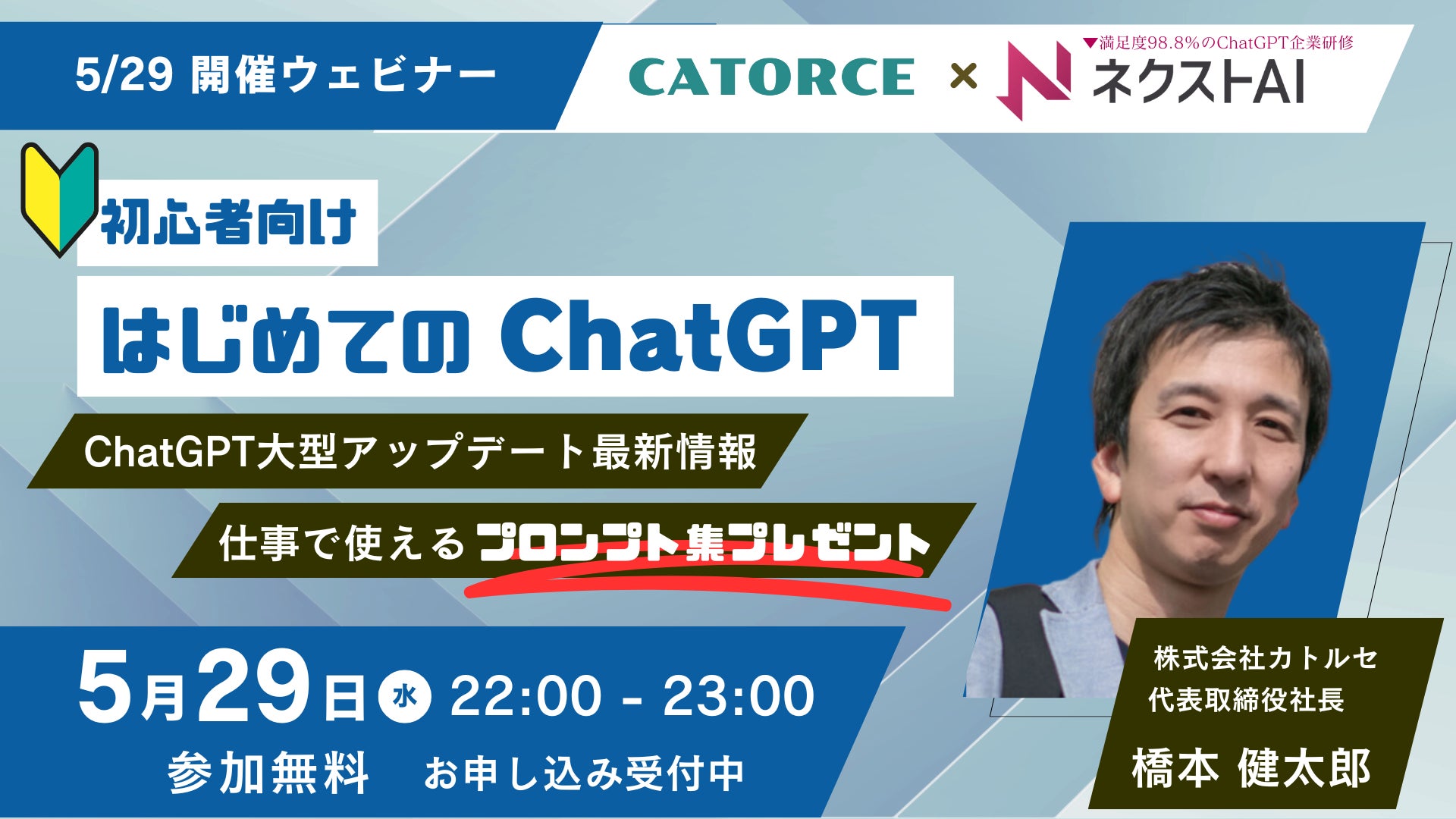 株式会社カトルセ(本社:東京都中央区、代表取締役:橋本健太郎、以下カトルセ)はオンラインセミナー『初心者向け はじめてのChatGPT』を5月29日(水)に開催いたします。