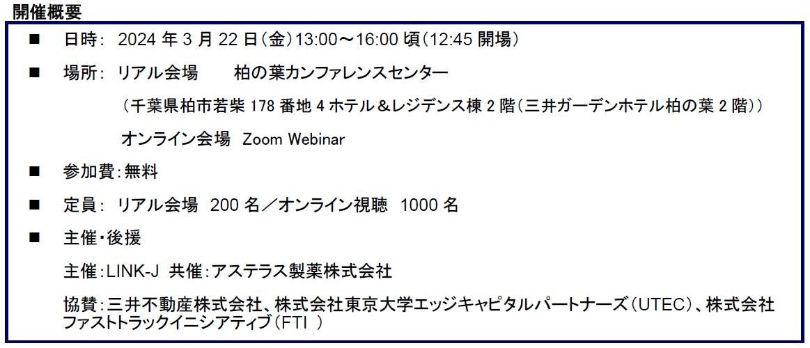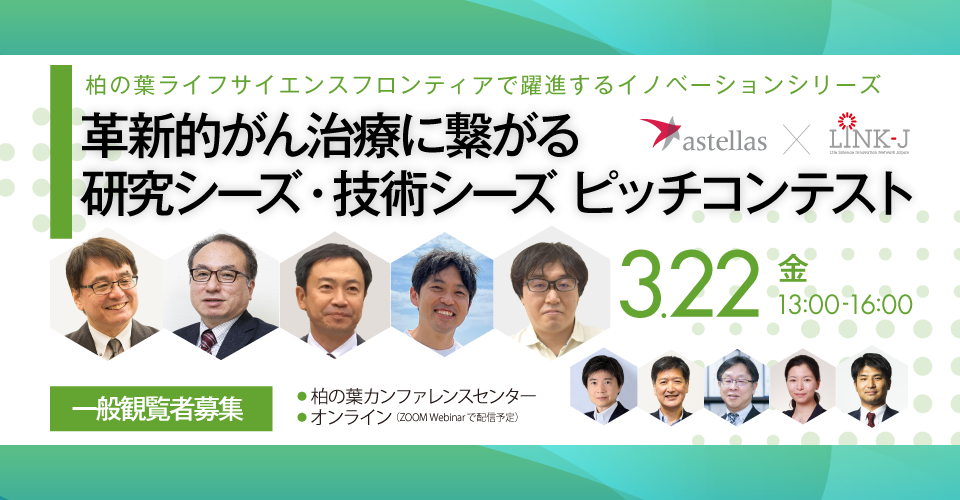 一般社団法人ライフサイエンス・イノベーション・ネットワーク・ジャパン(本社:東京都中央区、理事長:岡野栄之、以下LINK-J)は、2024年3月22日(金)、「柏の葉ライフサイエンスフロンティアで躍進するイノベーション」イベントシリーズの一環として、アステラス製薬株式会社(本社:東京都中央区、代表取締役社長CEO:岡村直樹、以下「アステラス製薬」)と共催で、「革新的がん治療に繋がる研究シーズ・技術シーズ ピッチコンテスト」を実施いたします。