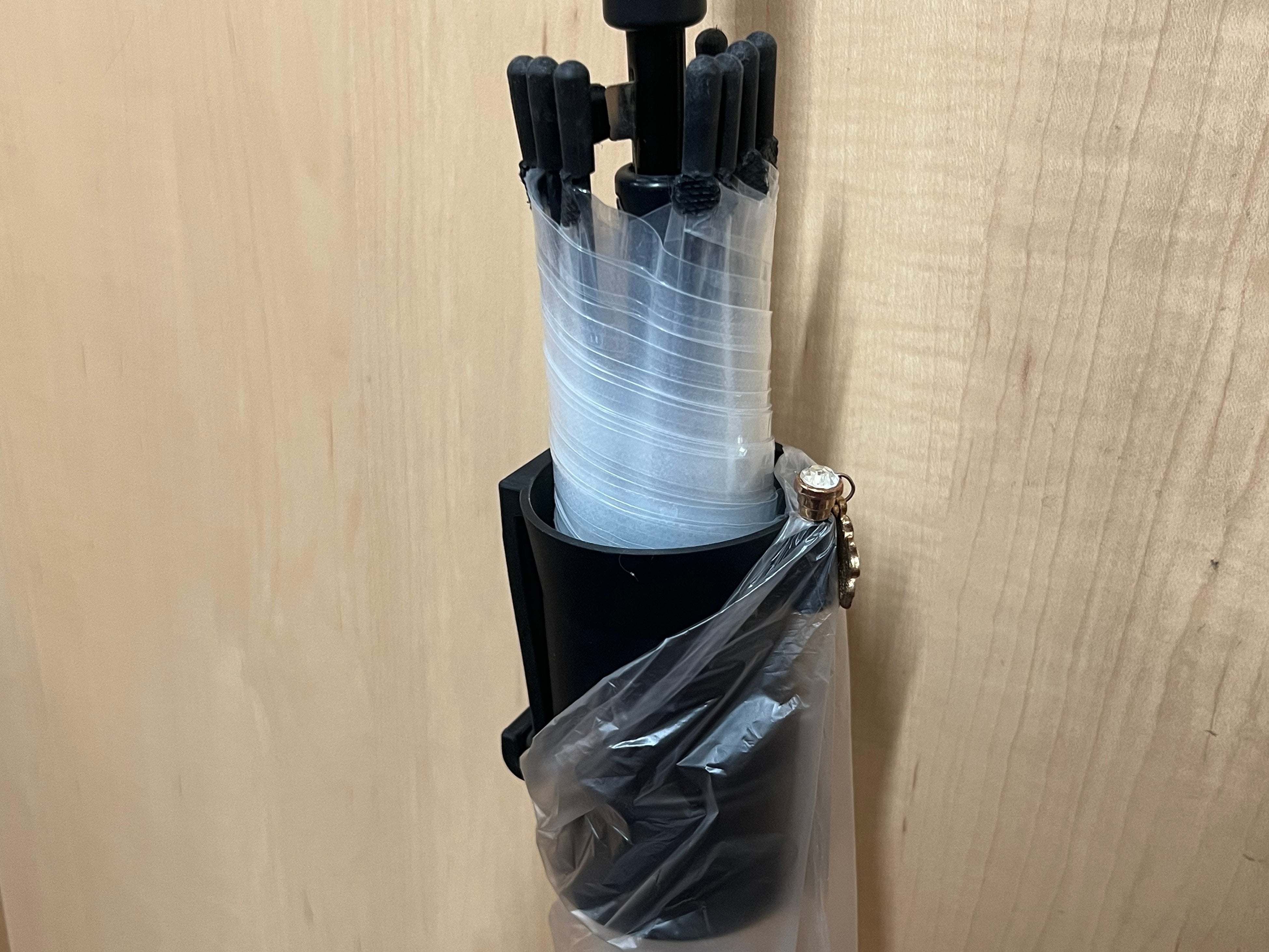 ④傘用のビニール袋に簡単に入れられイヤホンジャックアクセサリーで留められます。
