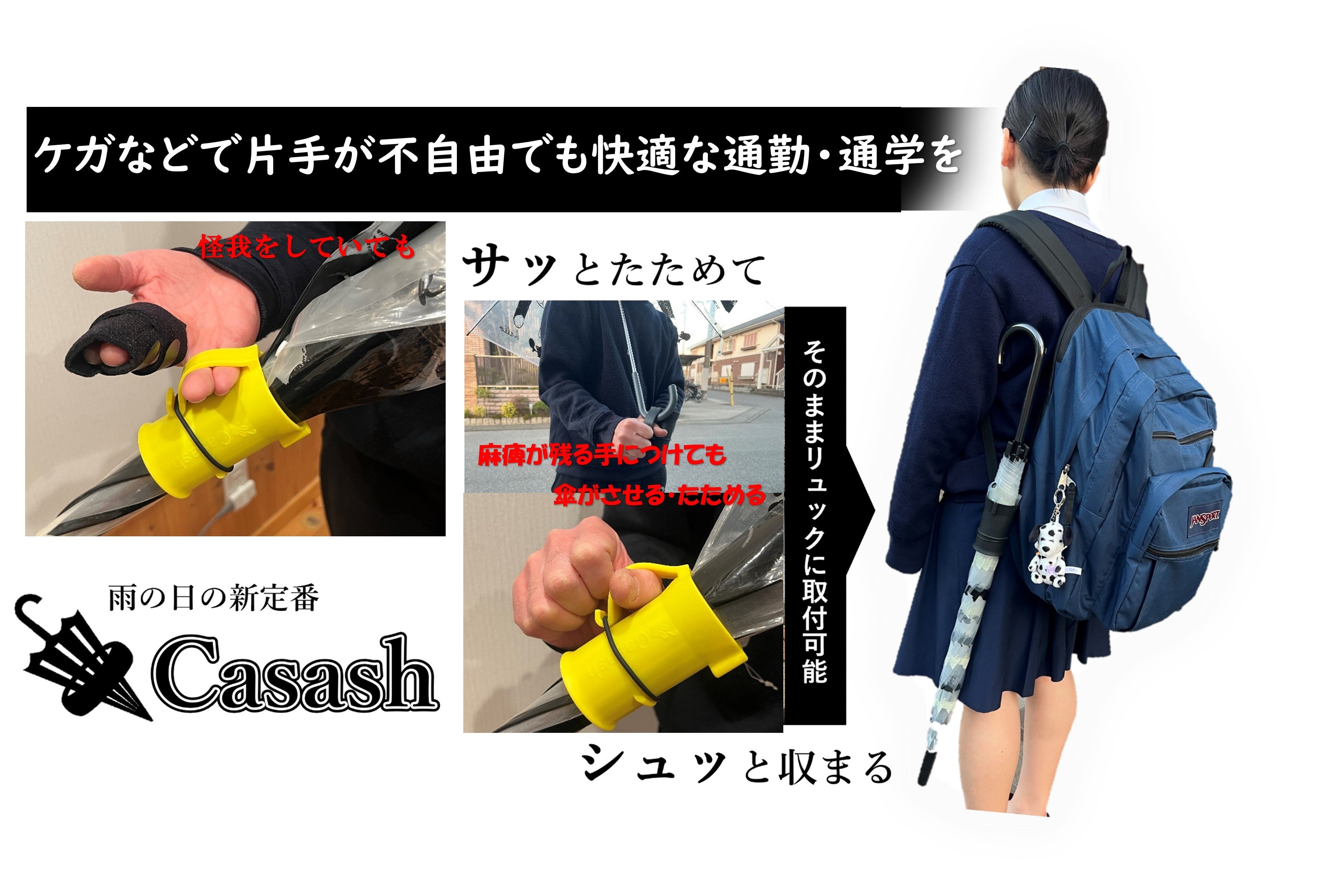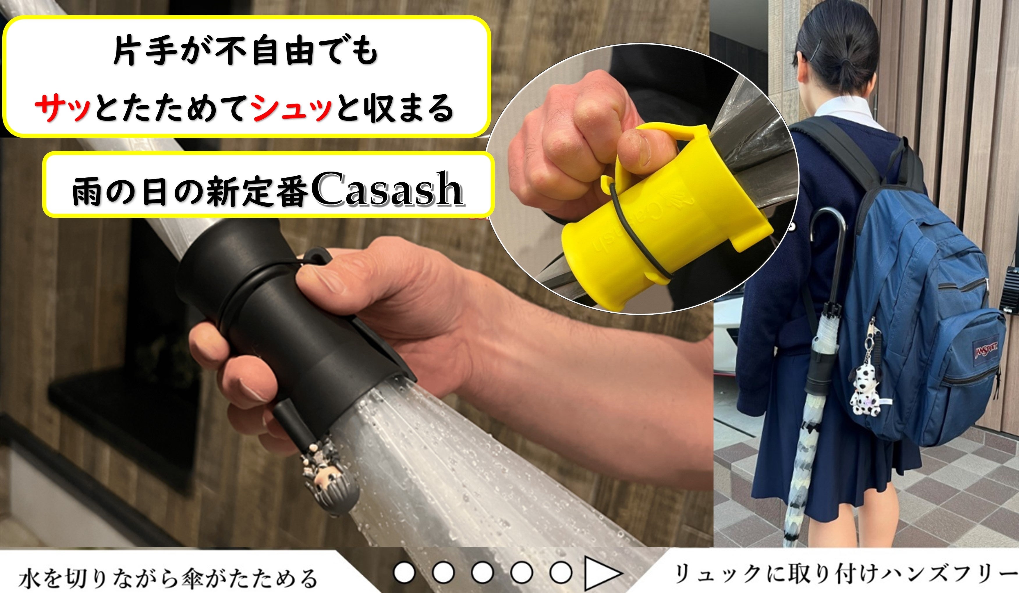 傘ホルダー「Casash」は手を濡らさず綺麗にたたみ水滴を取り、リュクやランドセルに付けてハンズフリーで移動。傘の「不」を解決する商品です。