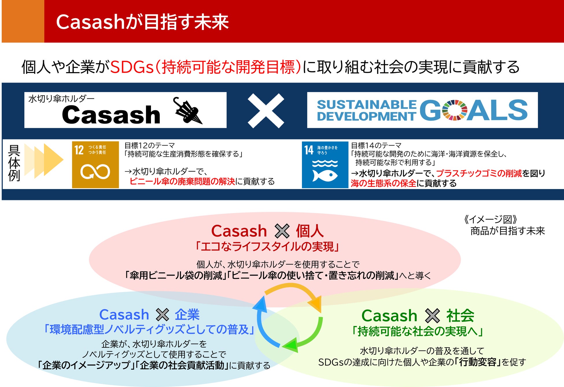 Casash/Casash+を日常生活で使用する事で、意識していなくても、社会問題になっている危険な傘の持ち方問題、環境問題につながる電車やバスでの傘の忘れ物問題、傘のビニール袋の削減とSDGsに貢献。