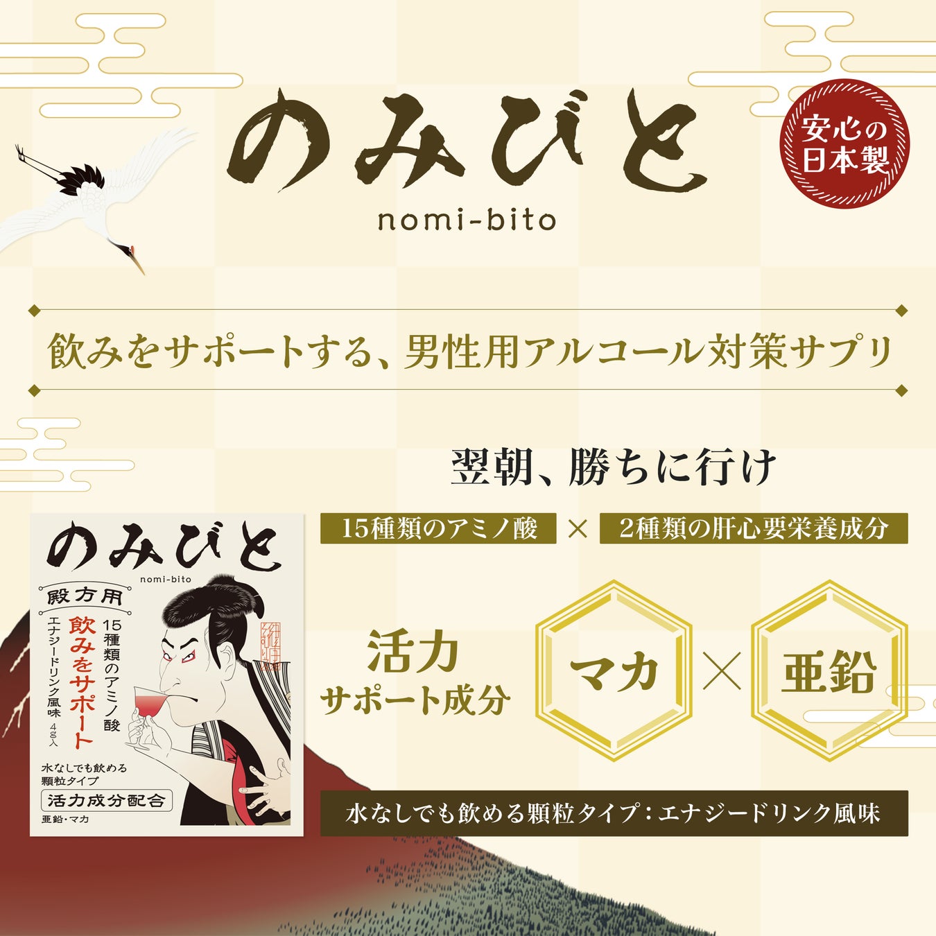 このような時代の背景の中で、より男性の健康的な飲酒の促進が必要不可欠という思いから、男性用アルコール対策サプリメント「のみびと(殿方用)」の開発に至りました。