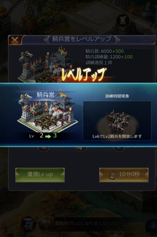 拠点には戦力を上げる施設や、武将の欠片を集める施設、様々な兵種を訓練できる施設など戦力に影響する重要なものばかり!