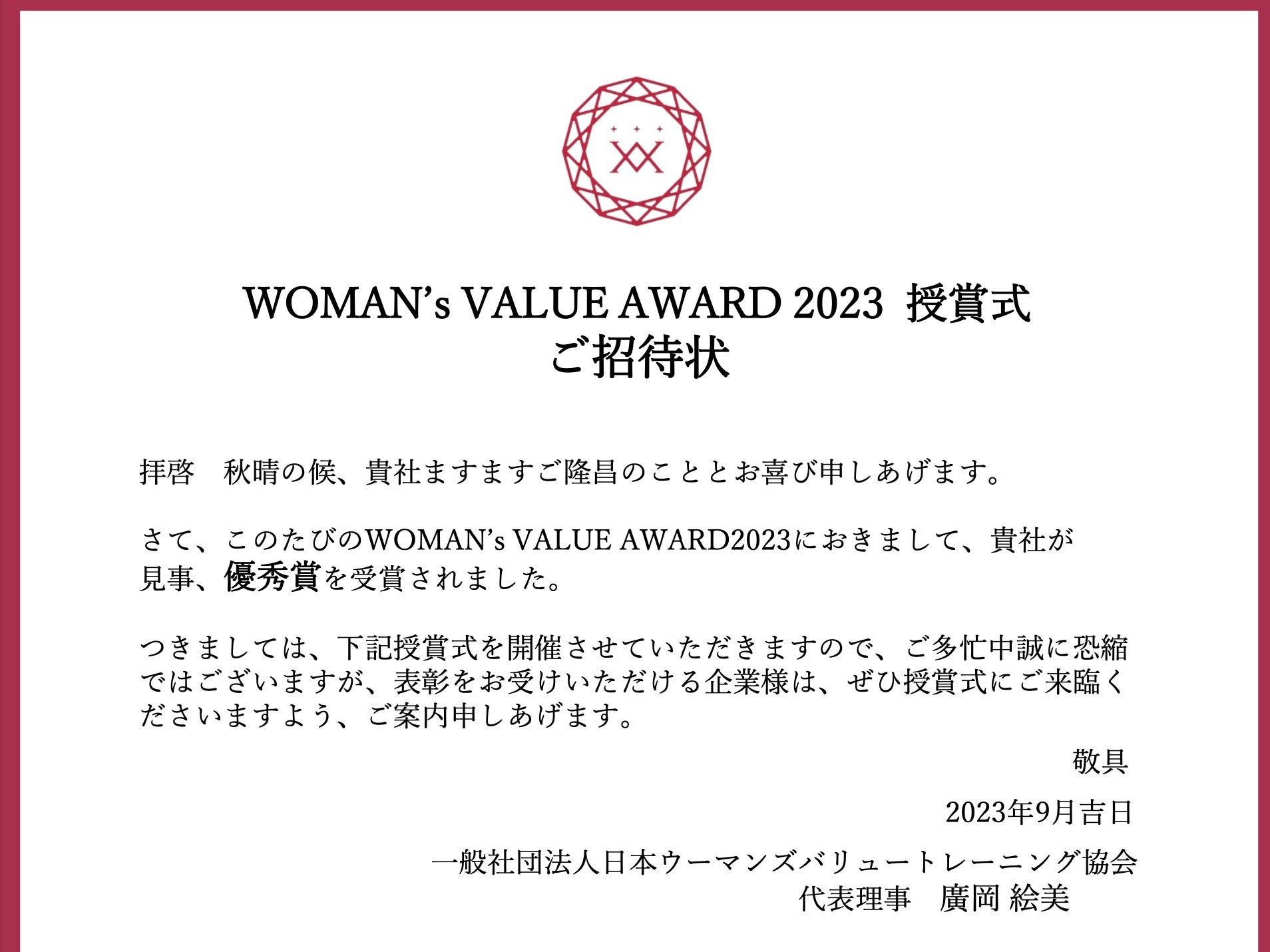 【女性の働きやすさを追求】WOMAN’s VALUE AWARD2023 優秀賞を受賞!