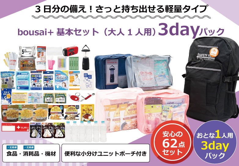 [防災セットのサブスク「+clueタスクルー」]bousai+基本セット(大人1人用)1dayパック/月額2,200円(税込)。bousai+基本セット(大人1人用)2dayパック/月額3,300円(税込)。bousai+基本セット(大人1人用)3dayパック/月額4,378円(税込)。詳細は「+clueタスクルー」HPをご覧くださいませ。https://www.tasclue.com/