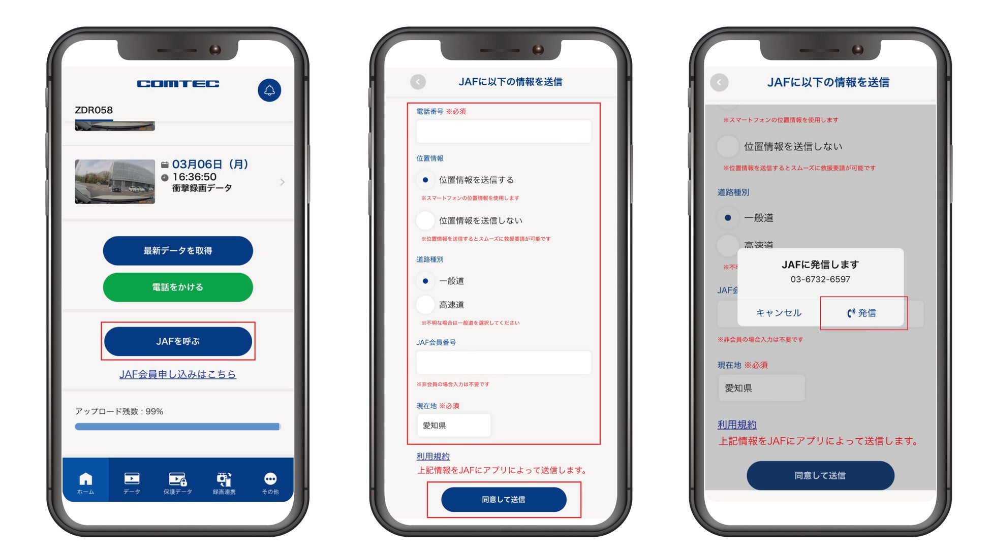 スマートフォン専用アプリ(COMTEC IoT)からJAFを呼ぶことが可能に。
