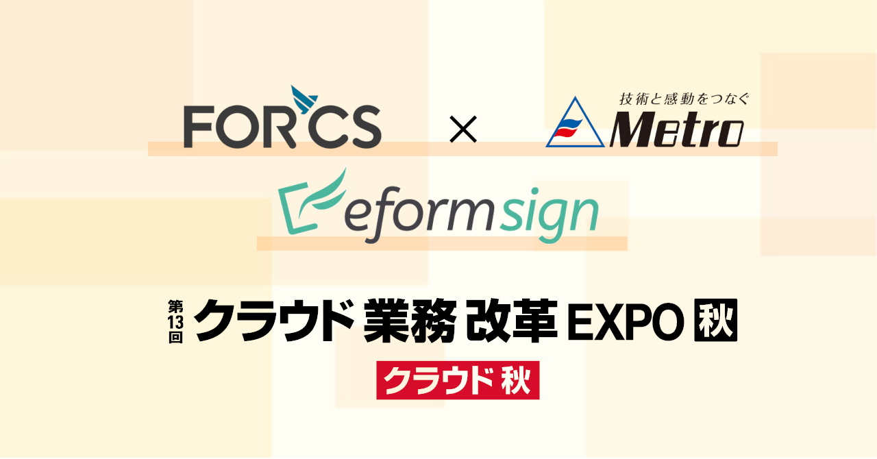 クラウドベース電子契約サービス「eformsign」を提供する日本フォーシーエス株式会社(本社:東京都千代田区、以下、「日本フォーシーエス」)は業務提携関係にある株式会社メトロ(以下、「メトロ」)と共同で、2022年10月26日から10月28日の3日間、幕張メッセで開催される「第13回 Japan IT Week 【秋】 」内「第12回 クラウド業務改革 EXPO【秋】」に出展することをお知らせいたします。