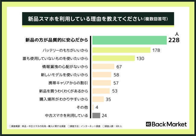 利用率が高い新品スマホのユーザーに、新品を選んだ理由をアンケート調査したところ、以下の通り端末の品質やバッテリーのもちに関する回答が多いことが分かります。