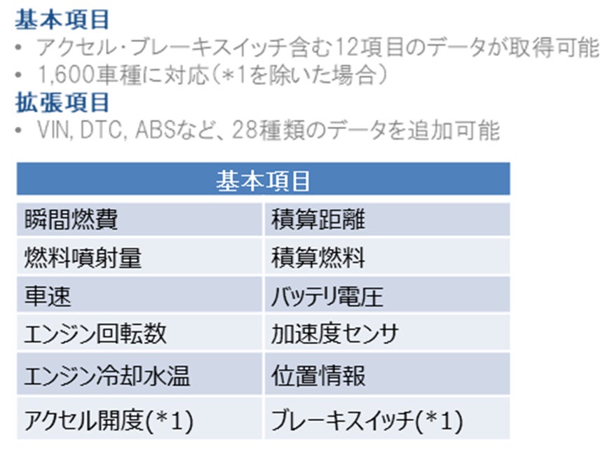 *1 OBDⅡ:オン・ボード・ダイアグノーシスの略で、車両に搭載されたコンピュータが行う自己故障診断システム用のコネクタ規格のバージョンアップ版で、車両故障診断情報の他、車速、エンジン回転数などの情報が取得可能です。