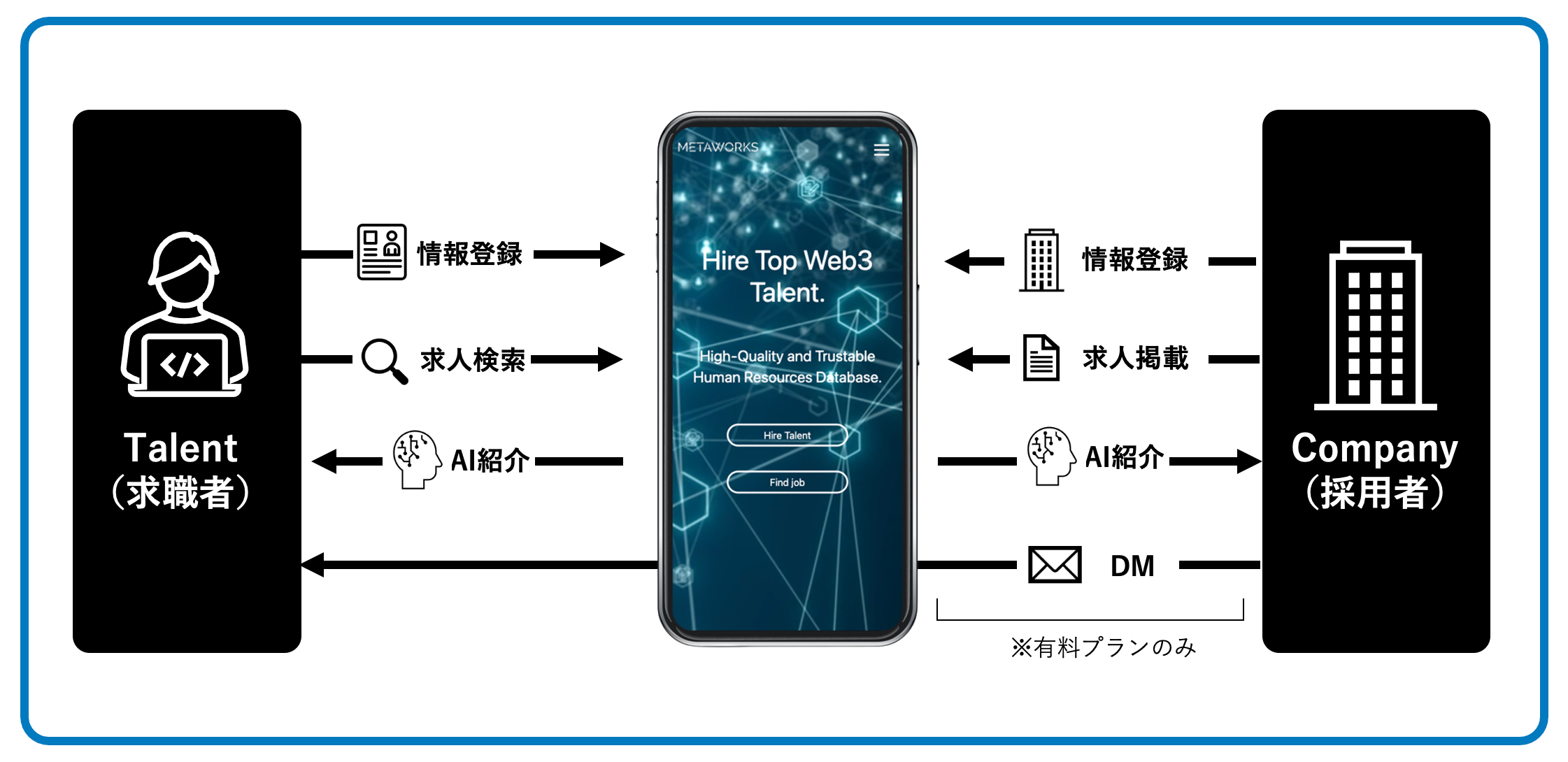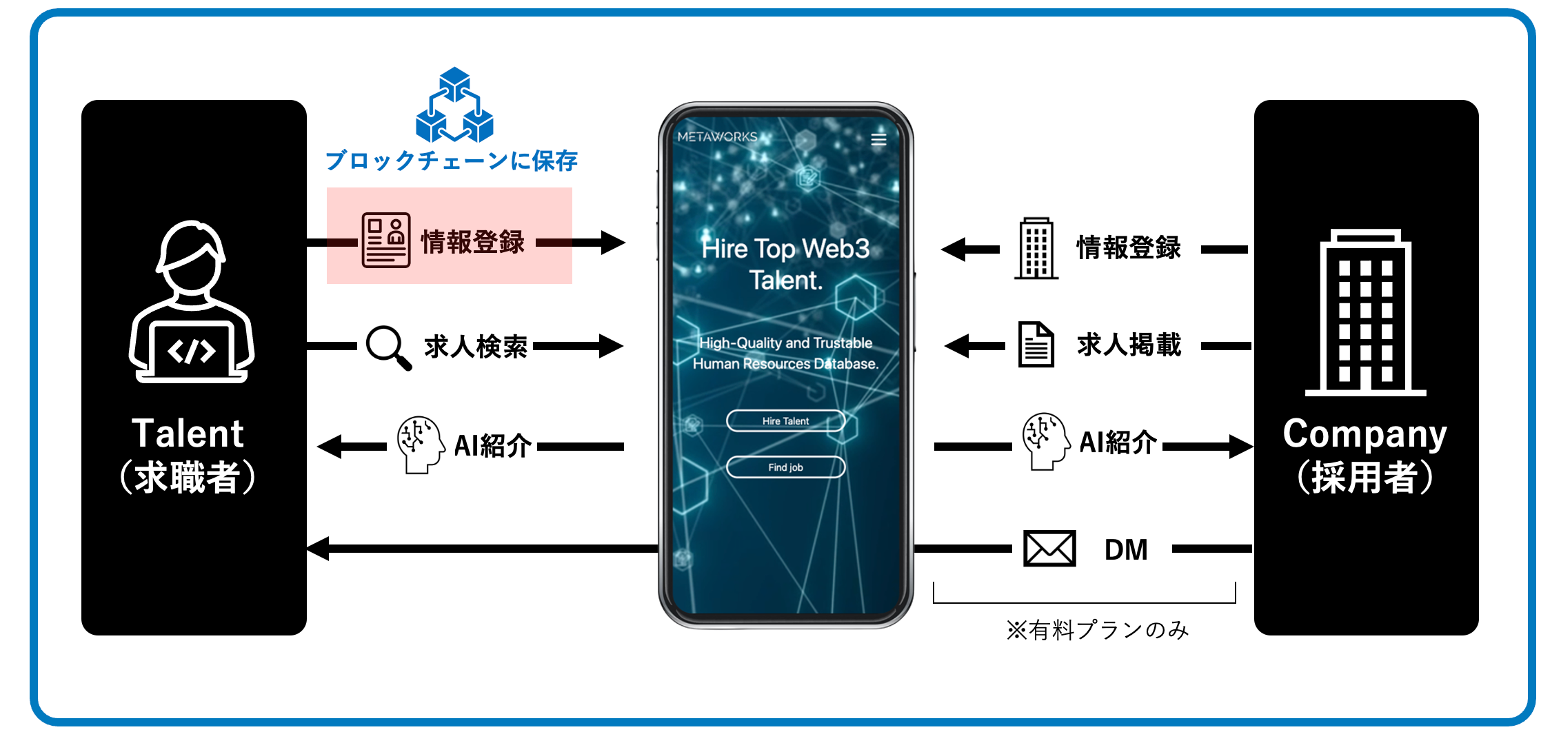 METAWORKSはジョブマッチングにブロックチェーンを組み込むことで、人材情報の信頼性を担保します。