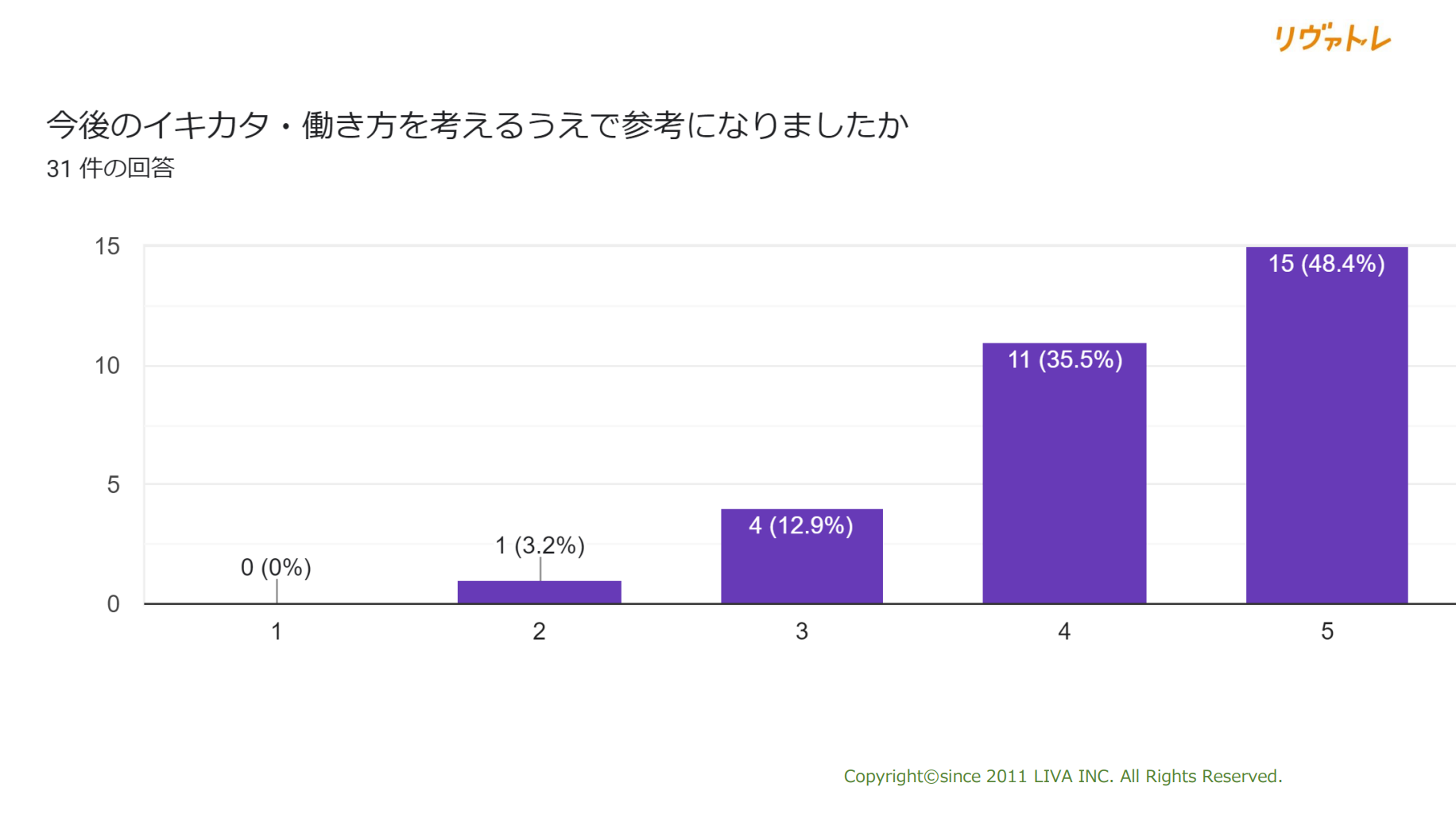 イベント参加者に対し事後アンケートを実施しました。「今後の自分が求める働き方・生き方に対して考える機会になったか?」という質問に対して、おおよそ8割の参加者が5段階評価中4または5と回答したことが分かりました。現役フリーランスの活躍や自分に合った働き方を聞き、今後の自身の活動や方針に対して収穫があったことと推察されます。
