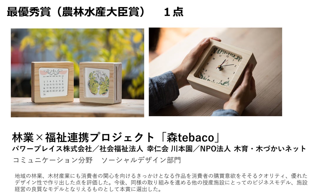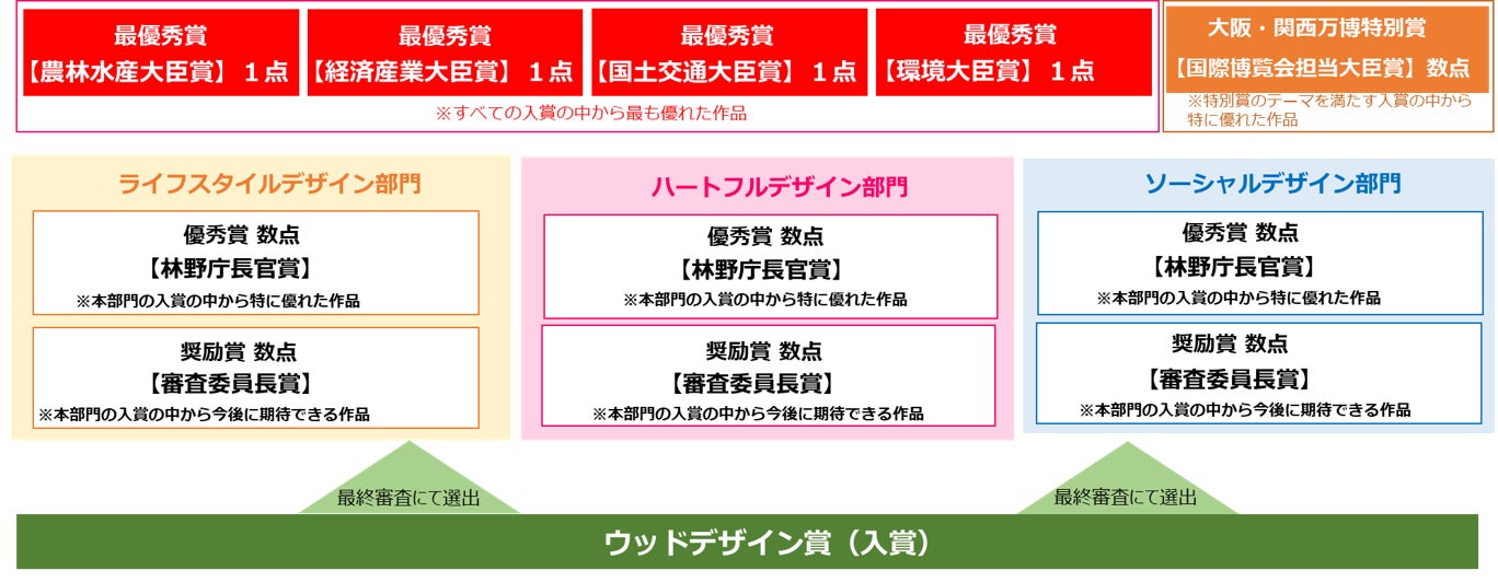 「ウッドデザイン賞」は、木で暮らしと社会を豊かにするモノ・コトを表彰し、国内外に発信するための顕彰制度です。 2015年に創設され、今回で9回目を迎えます。一般社団法人日本ウッドデザイン協会が主催するアワードとして、最優秀賞に「農林水産大臣賞」「経済産業大臣賞」「国土交通大臣賞」「環境大臣賞」が授与されます。