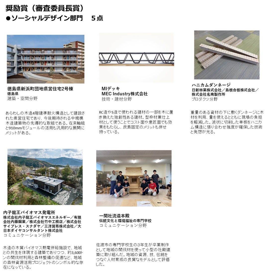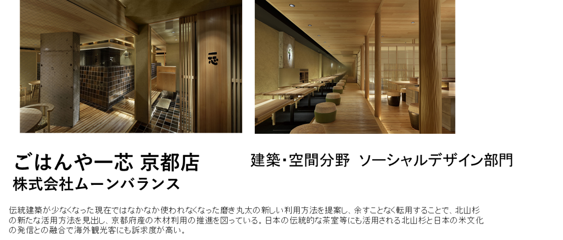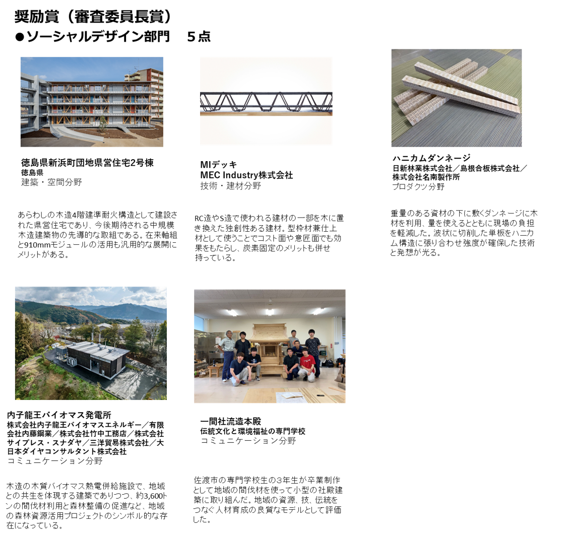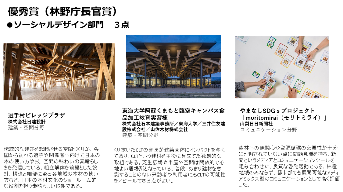 ソーシャルデザイン部門~木を活かして森林・林業や地域・社会の持続性を向上させているものが対象