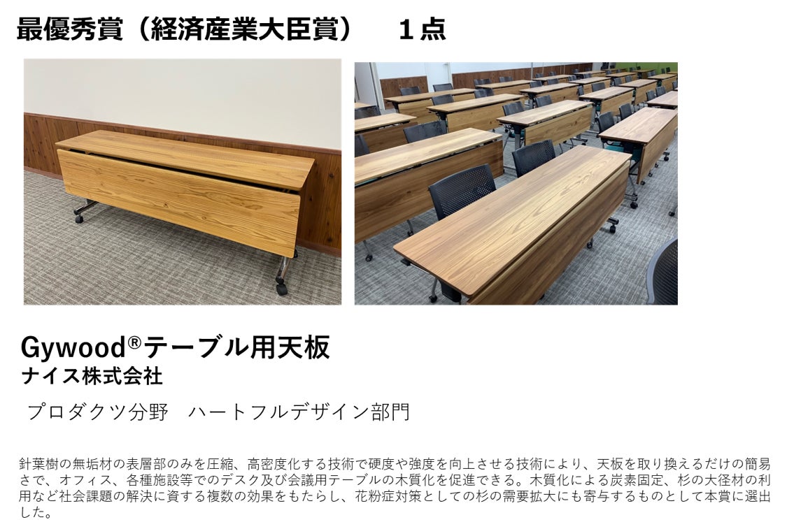 【内 容】①上位賞展示 ②受賞作品展示(受賞作品の一部) ③日本ウッドデザイン協会紹介