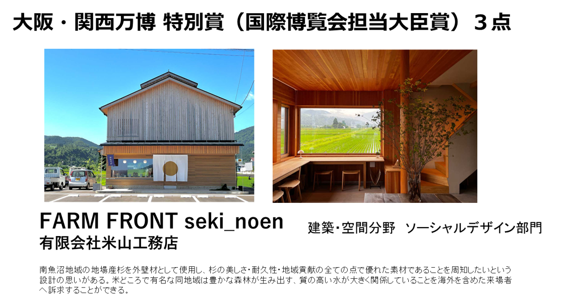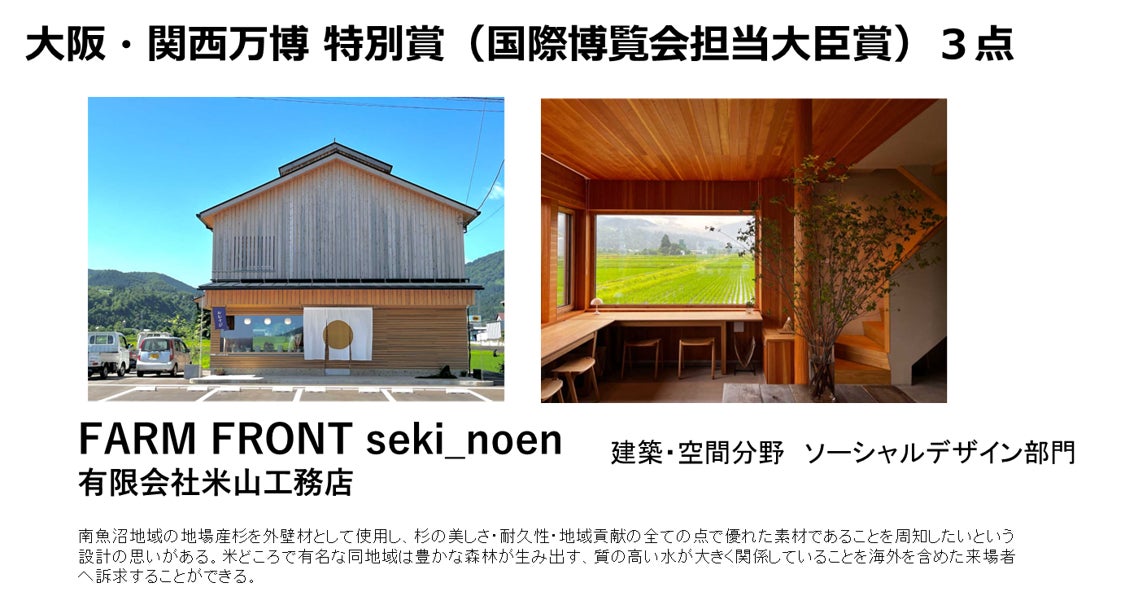 さらに2023においては、「大阪・関西万博 特別賞(国際博覧会担当大臣賞)」を新設いたしました。2025年4月13日~10月13日に開催される2025年日本国際博覧会(略称「大阪・関西万博」)のテーマ「いのち輝く未来社会のデザイン - Designing Future Society for Our Lives」の趣旨に基づき、ウッドデザイン賞の入賞作品のうち、「日本の木の文化・木のデザインを海外へ発信するにふさわしい、宿泊・飲食・体験施設、及びプロダクツ、活動等」を満たす優秀な作品に与えられます。