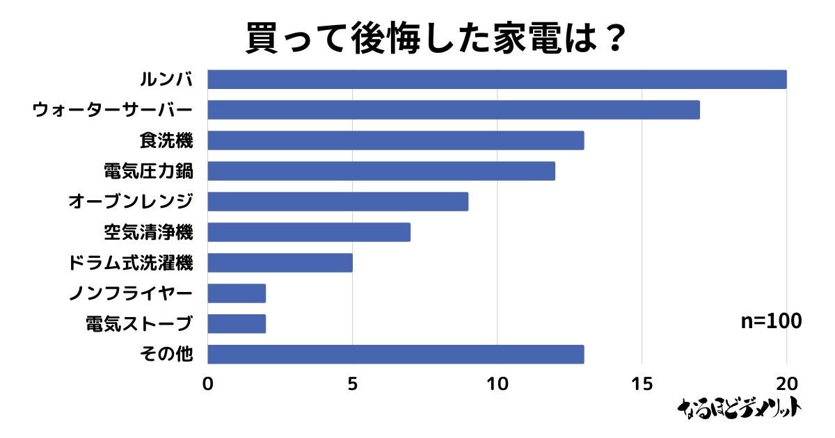 株式会社ACILが運営するモノやサービスに関する情報メディア『なるほどデメリット』(https://demerits.jp/)は、全国の男女100人を対象に「買って後悔した家電は?」をテーマとしたアンケート調査を実施致しました。