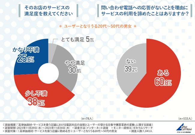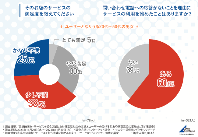 また、実際に電話応答がなかったお店のサービスを利用した方は少数であり、利用したもののサービスに不満を感じた方が多いことも明らかになりました。