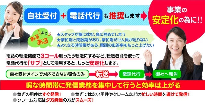 近年では、かかってきた電話を転送して電話代行サービスの方に対応していただくというサービスも普及しています。