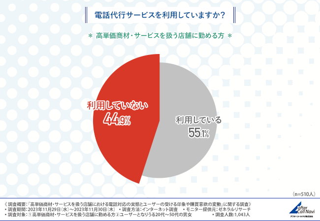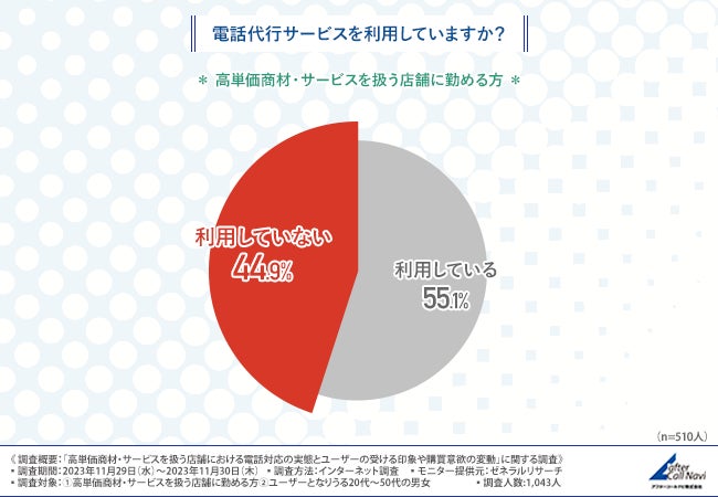 先程の調査結果で、高単価商材・サービスを扱う店舗に勤める方の電話代行サービス利用状況や、利用していない理由について明らかになりました。