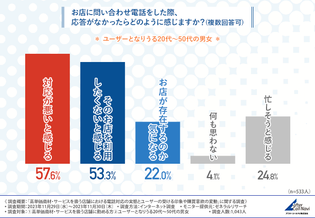 そこで今回、電話代行サービス「アフターコールナビ」(https://www.axs-f.com/)を運営するアフターコールナビ株式会社は、①高単価商材・サービスを扱う店舗に勤める方、②ユーザーとなりうる20代~50代の男女を対象に、「高単価商材・サービスを扱う店舗における電話対応の実態とユーザーの受ける印象や購買意欲の変動」に関する調査を実施しました。