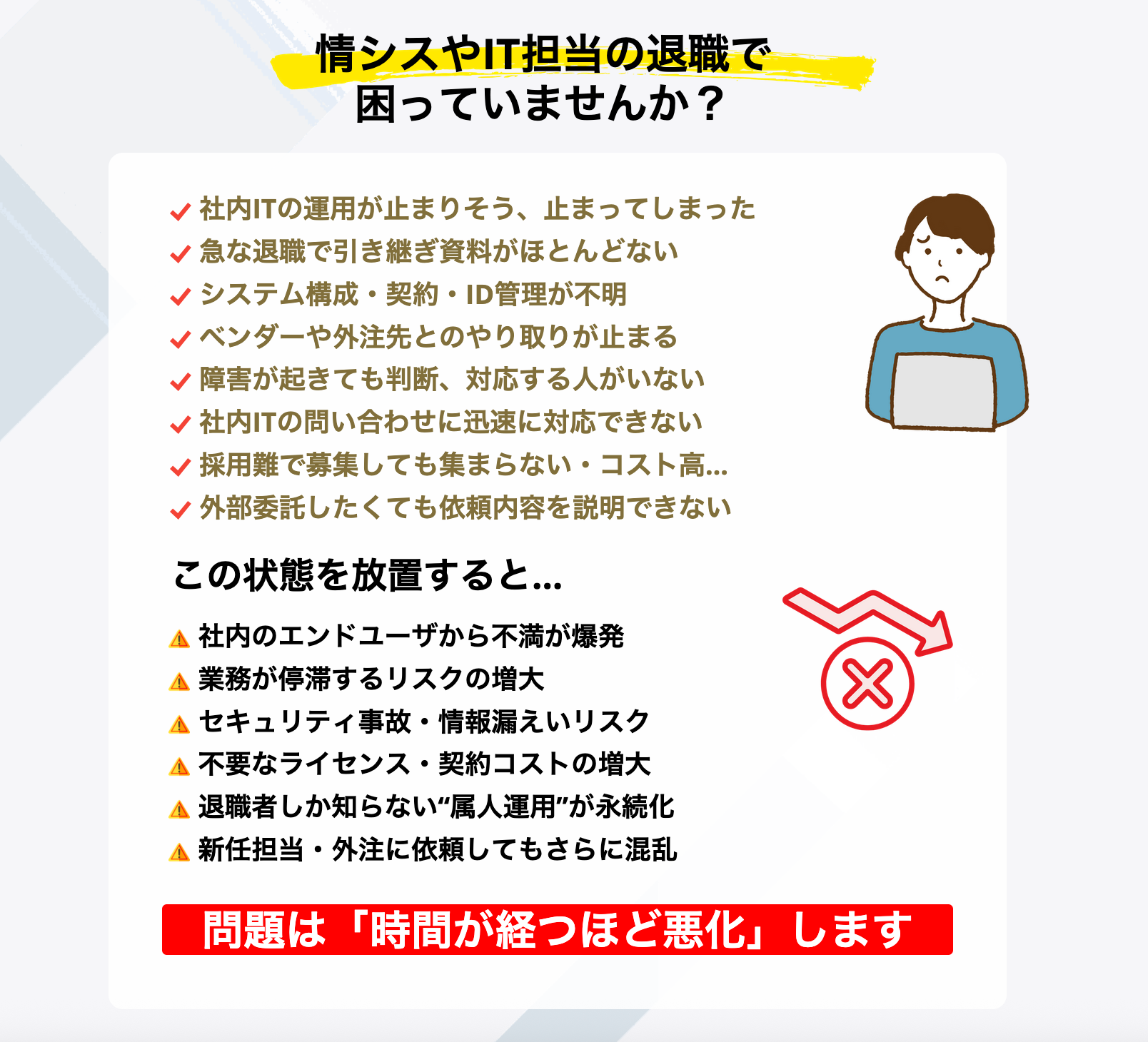 ■ サービス提供の背景 :IT人材不足と情シス業務の急増が、退職・引き継ぎ問題を深刻化させています