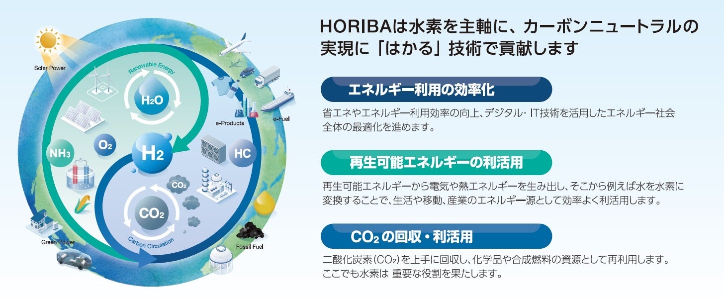 HORIBAは、水素をはじめとする新エネルギーをかしこく「つくる」「ためる」「つかう」ためのあらゆるプロセスに、 分析・計測の側面から最適な分析・計測技術を提案することで、カーボンニュートラルの実現に貢献していきます。