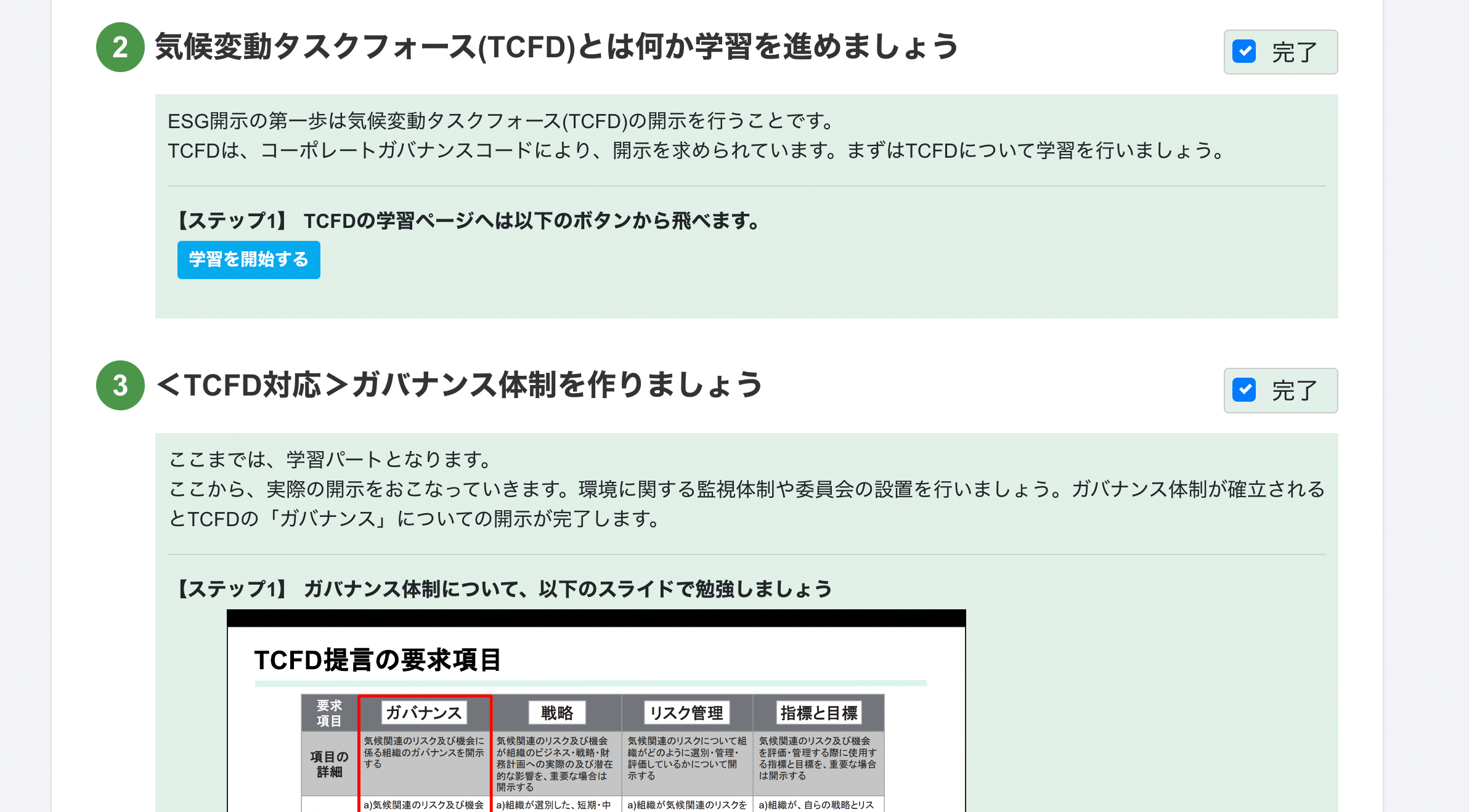 ESGとはなにか?TCFDとはなにか?などの初学者向けのガイダンスから、具体的なシナリオ分析やリスクと機会の選定、CO2算定まで行えます。ガイダンスに従い開示を行なっていくだけでTCFD対応を行えます。