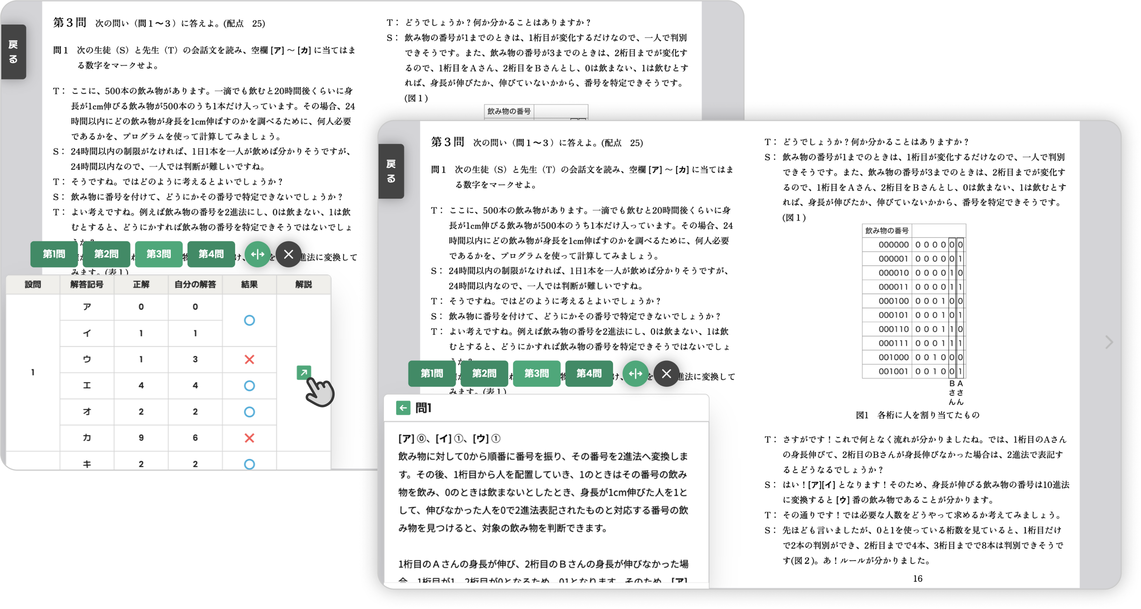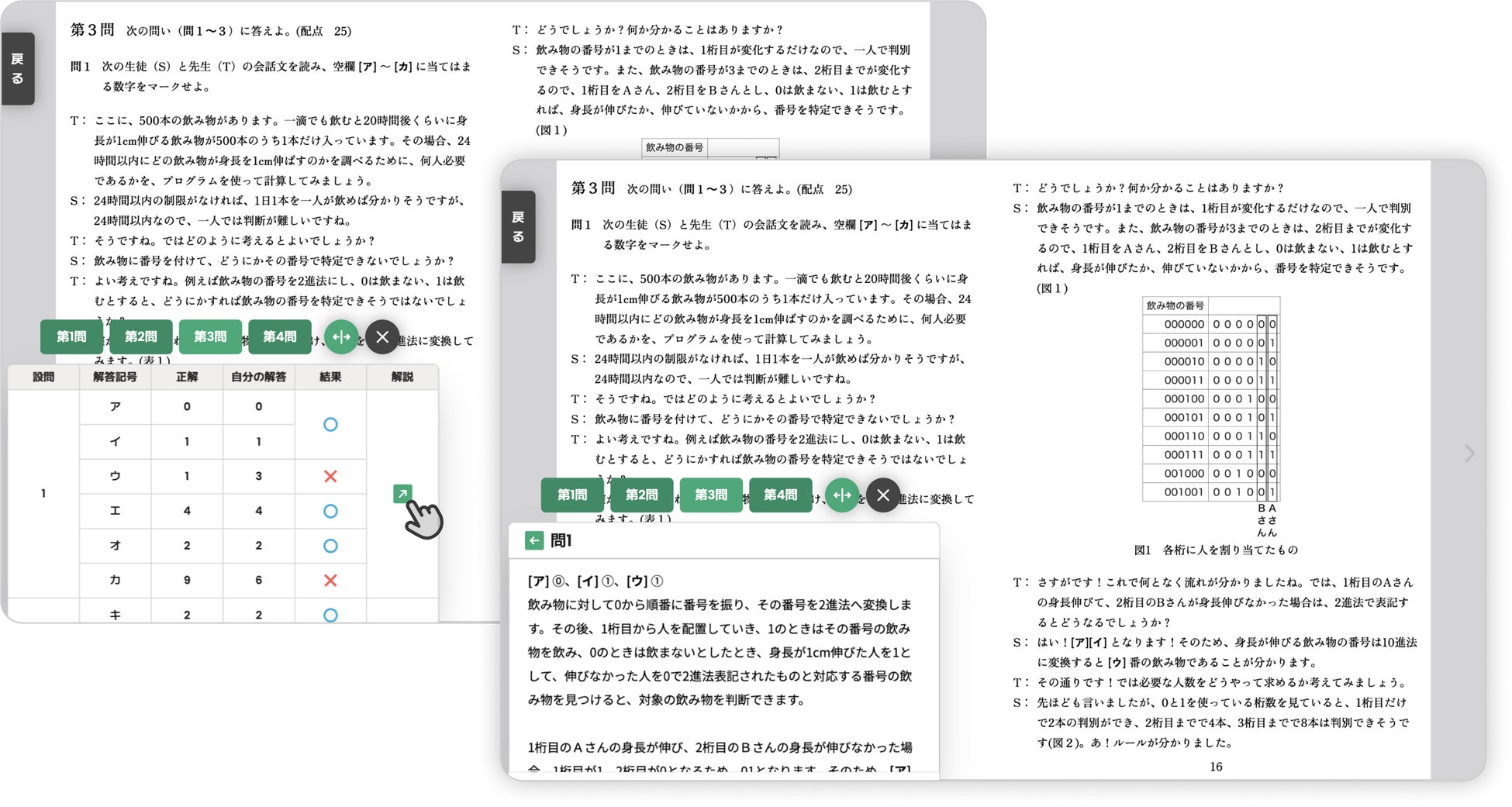 全問解答後に即時採点を行い、正解率や間違った箇所を素早く把握できます。その結果を元に、個々の弱点や苦手な領域を特定し、直ちに学習や復習を行うことで、学習の効率を高め、自己の実力向上につなげることができます。