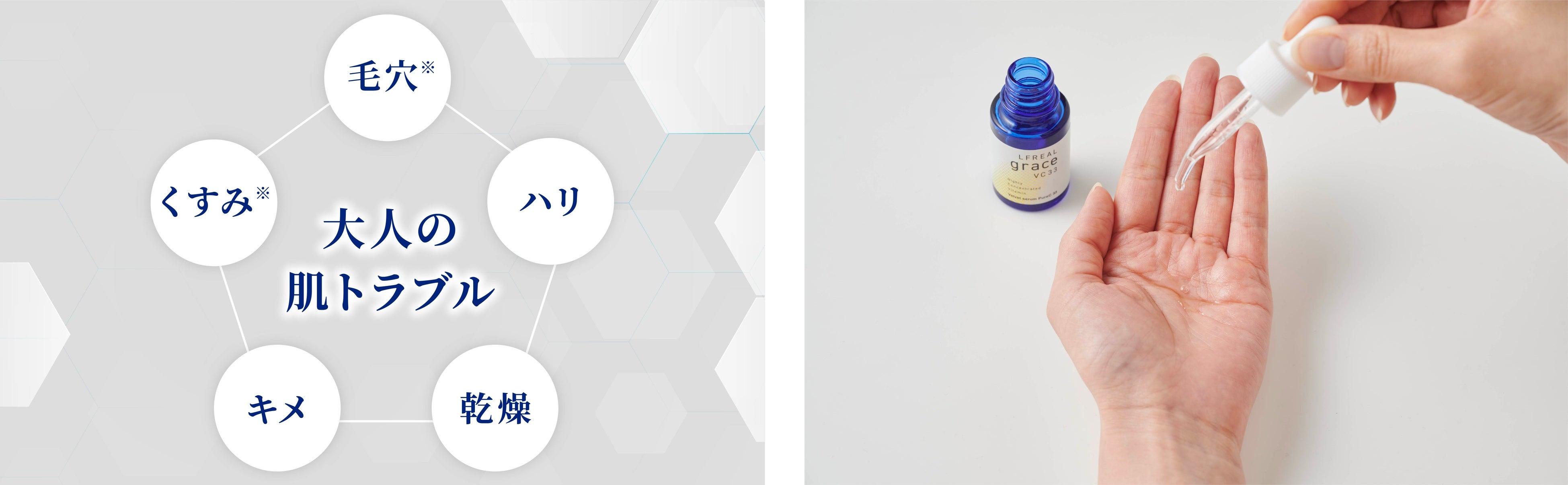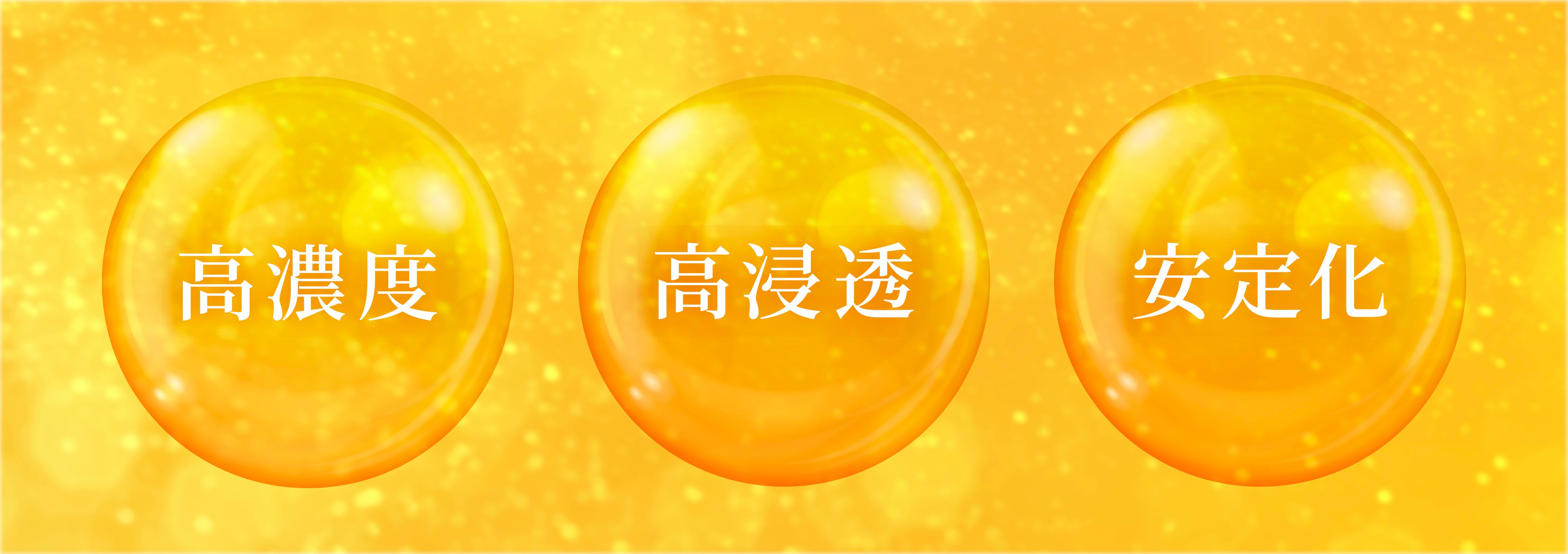 様々なチカラを持つビタミンC※3 は、皮膚に塗布した瞬間からすぐに働き始める即効性に優れている反面、水に溶解させたり、空気に触れることで不安定になりやすい性質をもっています。そのため、安定化した状態で配合することが難しい、とてもデリケートな成分でもあります。