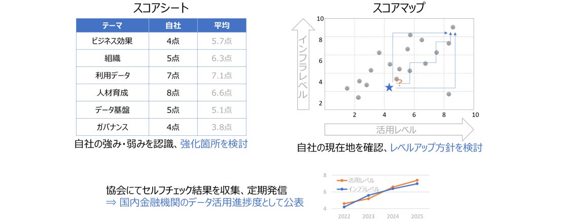 各金融機関が自社のデータ活用レベルをセルフチェックし、今後の施策を検討するためのものです。また、国内金融機関のデータ活用進捗度を可視化し、業界全体のレベルアップを促進することを目指しています。